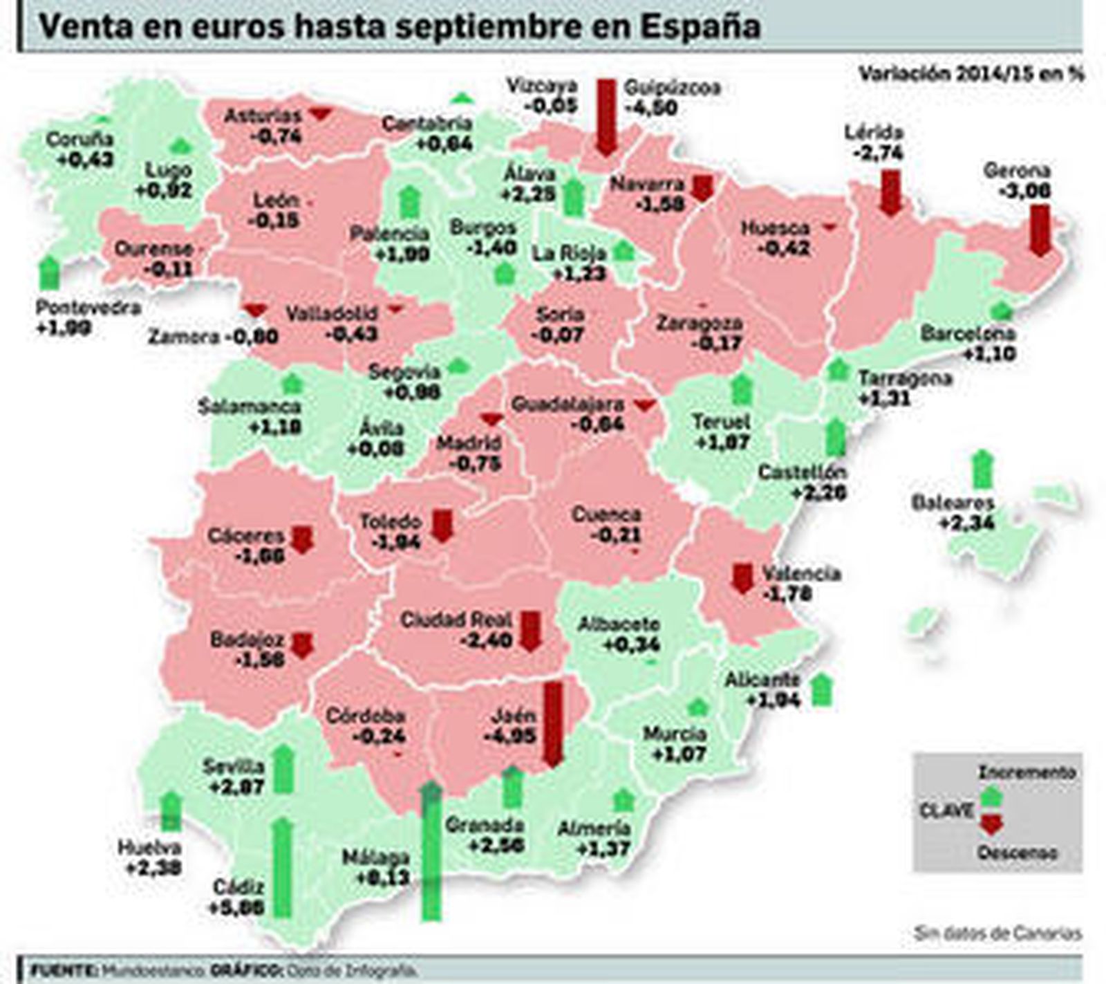 La ola de crecimiento experimentada en Andalucía contrasta con el comportamiento a nivel nacional, donde el mercado tiende a una cierta estabilidad, aunque a la baja. Así lo demuestra el descenso del 1,2 % de cajetillas de cigarrillos vendidas, con una cantidad total de 1.761 millones. Durante septiembre, las ventas de cajetillas de cigarrillos descendieron un 0,89 %; los cigarros un -4,48 %; la picadura de liar un -3,47 % y la de pipa un -5,01 %. Asimismo, las ventas de cajetillas en las denominadas zonas turísticas y fronterizas, de enero a septiembre, bajaron un 1,24 % y suponen el 12,27% del total de las ventas realizadas en el país.