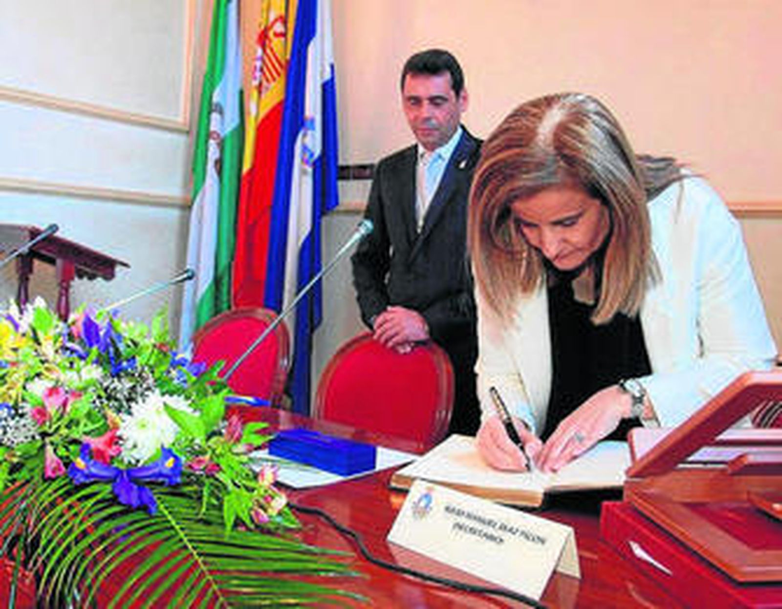 "Emocionada, llena de cariño y con un agradecimiento infinito", Báñez recibió este sábado las felicitaciones y palabras de ánimo de cientos de vecinos que la esperaron con los brazos abiertos en la plaza del Ayuntamiento. A las puertas del Consistorio aguardaba la corporación municipal al completo y todas las autoridades locales, incluidos los anteriores alcaldes de la democracia, como el socialista Francisco Orta. Ya en el salón de Plenos, el actual regidor, Manuel Bueno (PA), le hizo entrega de varios obsequios conmemorativos de esta primera visita, entre ellos, un cuadro con la imagen del retablo del altar mayor de la iglesia de San Juan Bautista, que la ministra aseguró que colgará en su despacho.