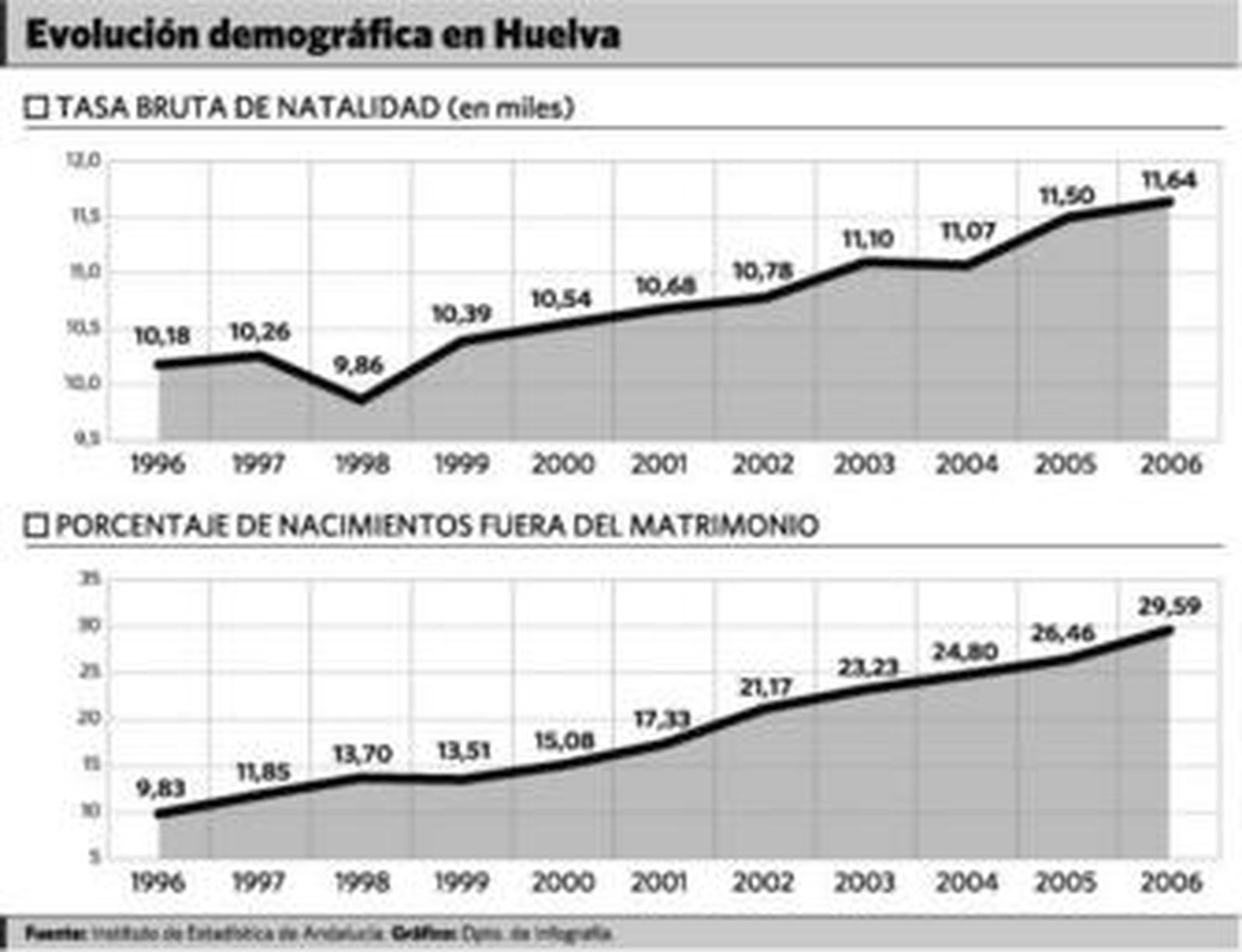 Por primera vez en tres décadas los nacimientos en la provincia de Huelva han dejado de caer en picado. Según los datos del Instituto de Estadística de Andalucía correspondientes a 2006, último ejercicio de estudio, la tasa bruta de natalidad se sitúa en el 11,64 (por mil habitantes), punto arriba o abajo respecto a las restantes provincias andaluzas y siguiendo la misma tónica que el conjunto de la comunidad, lo que apunta, si no a la recuperación, al menos al mantenimiento de la natalidad.