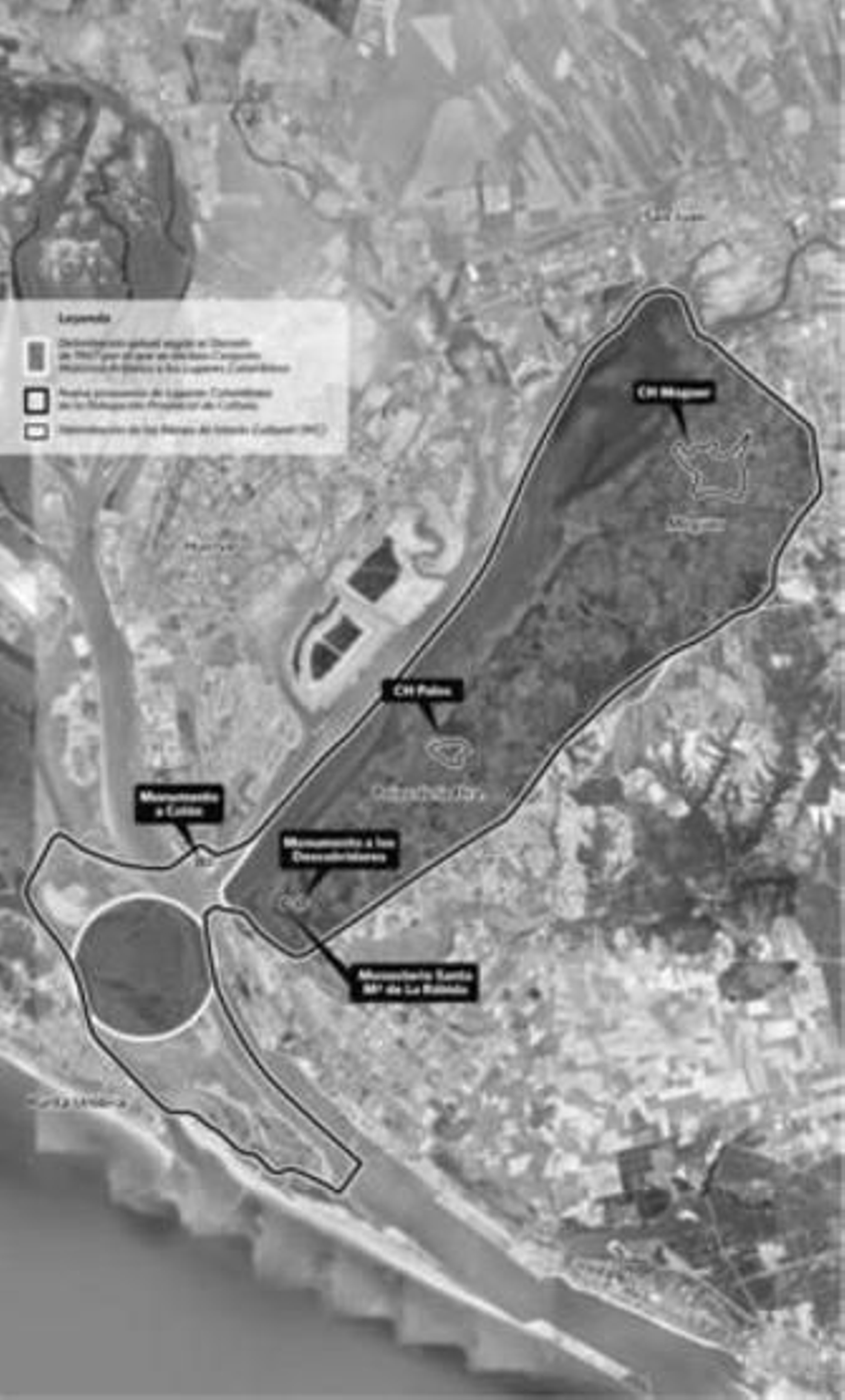 Englobará el Monumento a Colón, que será declarado BIC; el tramo de agua hasta Saltés, incluida la ciudad almohade; el Monasterio y la Columna de La Rábida y los Conjuntos Históricos de Palos y Moguer