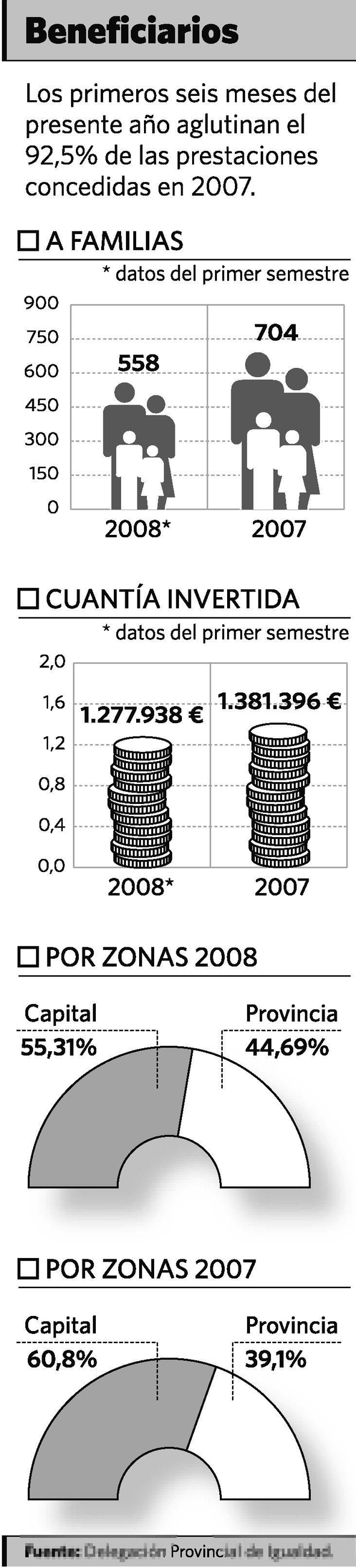 La cuantía de este primer semestre de 2008 se ha traducido en la aprobación de 558 expedientes, lo que supone el 72,2% respecto a los aprobados el pasado año -con 704- y 1.446 beneficiados frente a los 1.756 onubenses acogidos al salario social en el anterior ejercicio.