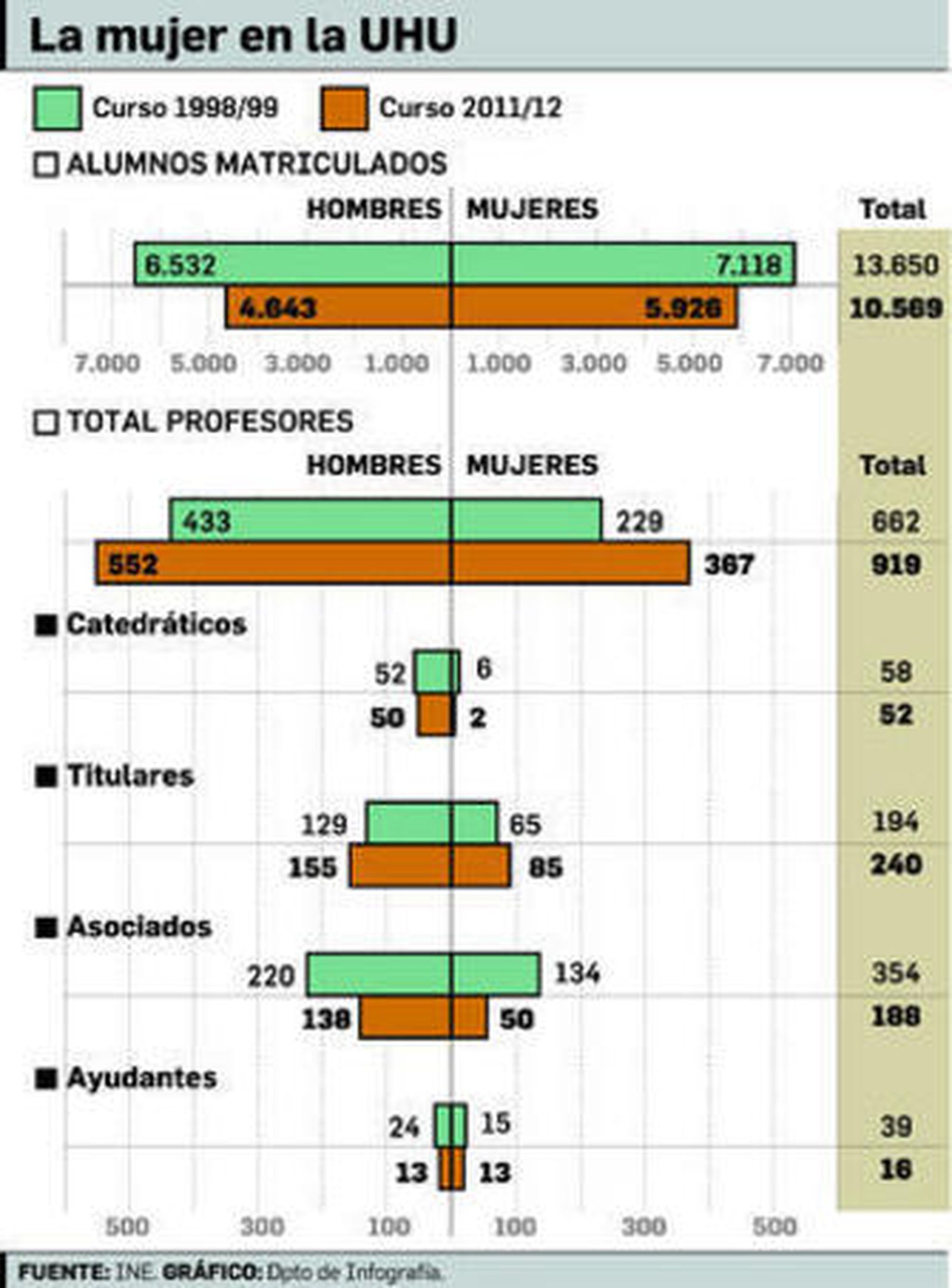Para comprender en gran medida los porqués de esta evolución hay que echar un vistazo a lo que pasa en la propia UHU y ver qué composición presenta en dos de sus tres estamentos -profesorado y alumnos-, entre los que, pese a todo lo dicho con anterioridad, se confirman curso tras curso dos principios: las diferencias, a favor de los hombres, en el cuerpo docente, y la supremacía femenina, en el colectivo estudiantil. Aunque la preponderancia femenina en el alumnado pueda parecer un hecho reciente, los datos ofrecidos por el Instituto Nacional de Estadística (INE) indican que se remonta, como mínimo, 15 años atrás; en el curso 1998/99, el 52% de los estudiantes eran mujeres. Si miramos la proporción en el 2011/12, último que muestra el INE, se puede ver que el porcentaje es del 56%, es decir 4 puntos más que 15 años atrás. Curiosamente, esta evolución demuestra que no se consigue un equilibrio entre géneros tal y como se refleja en la propia estructura de la sociedad: si antaño el predominio masculino lo impedía, ahora la propia decisión de las mujeres lo inclina a su favor.