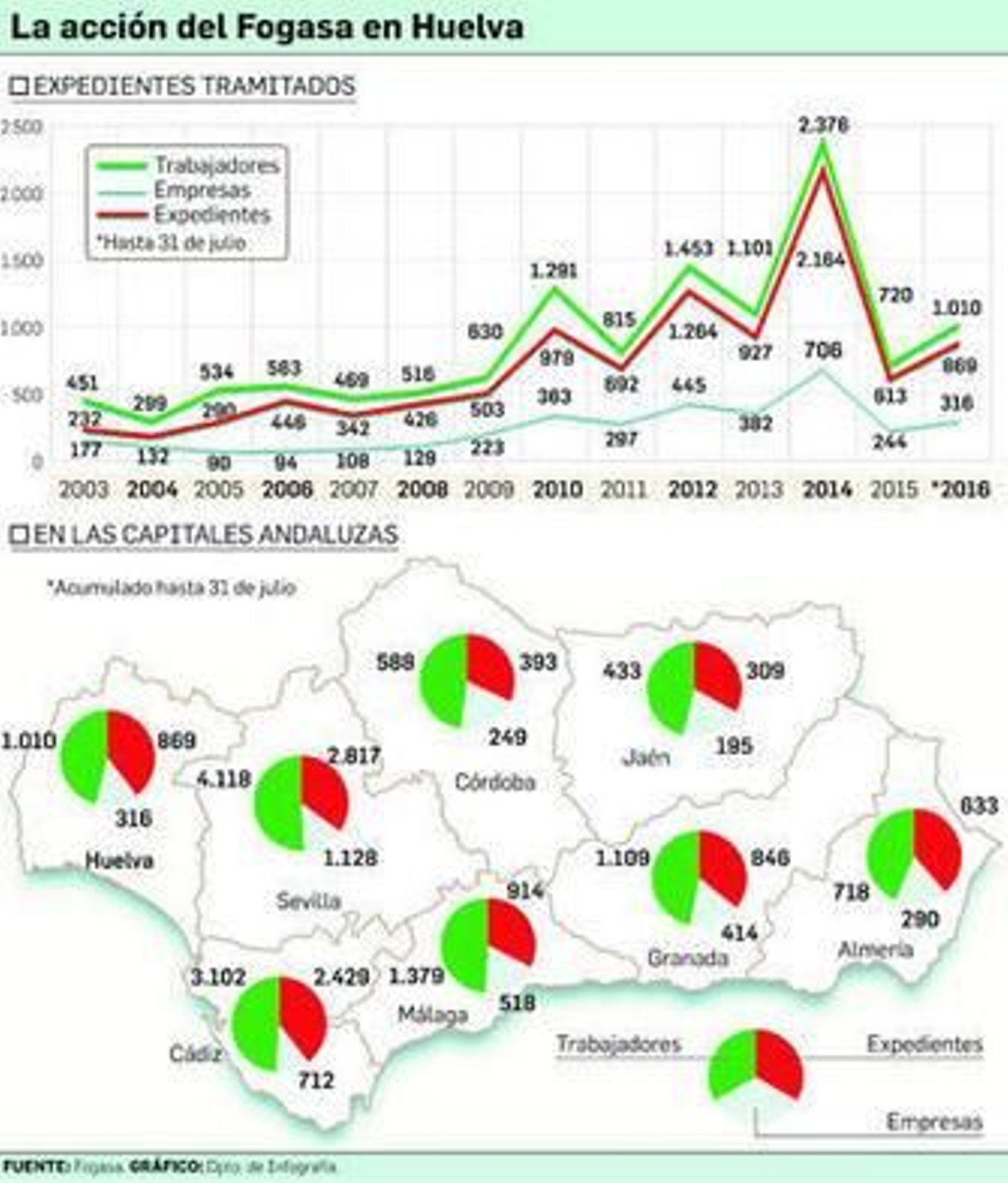 A 31 de diciembre de 2014, los trabajadores afectados por la insolvencia de sus empresas en la provincia de Huelva superaban los 2.300 integrados en más de 2.100 expedientes tramitados por el Fogasa procedentes de 706 empresas onubenses.
