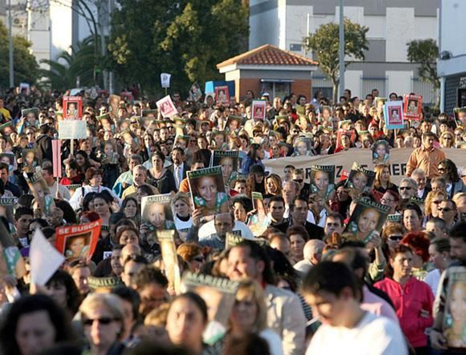Alrededor de 5.000 personas partieron entonces de El Torrejón. La gran pancarta azul y blanca con el lema ‘Ayúdanos a encontrar a Mari Luz’ y tras la que se refugiaban también Arsenia Hernández y Juan Cortés, abuelos de la niña, reflejaba los rayos anaranjados del ocaso onubense. Sobre las 17.35 horas la comitiva se adentraba en la barriada de La Hispanidad. Entonces la masa, que antes había caminado en silencio, comenzó a gritar frases como “¡Mari Luz, cariño, Huelva está contigo!” o “¡Que venga a casa la niña Mari Luz!”.