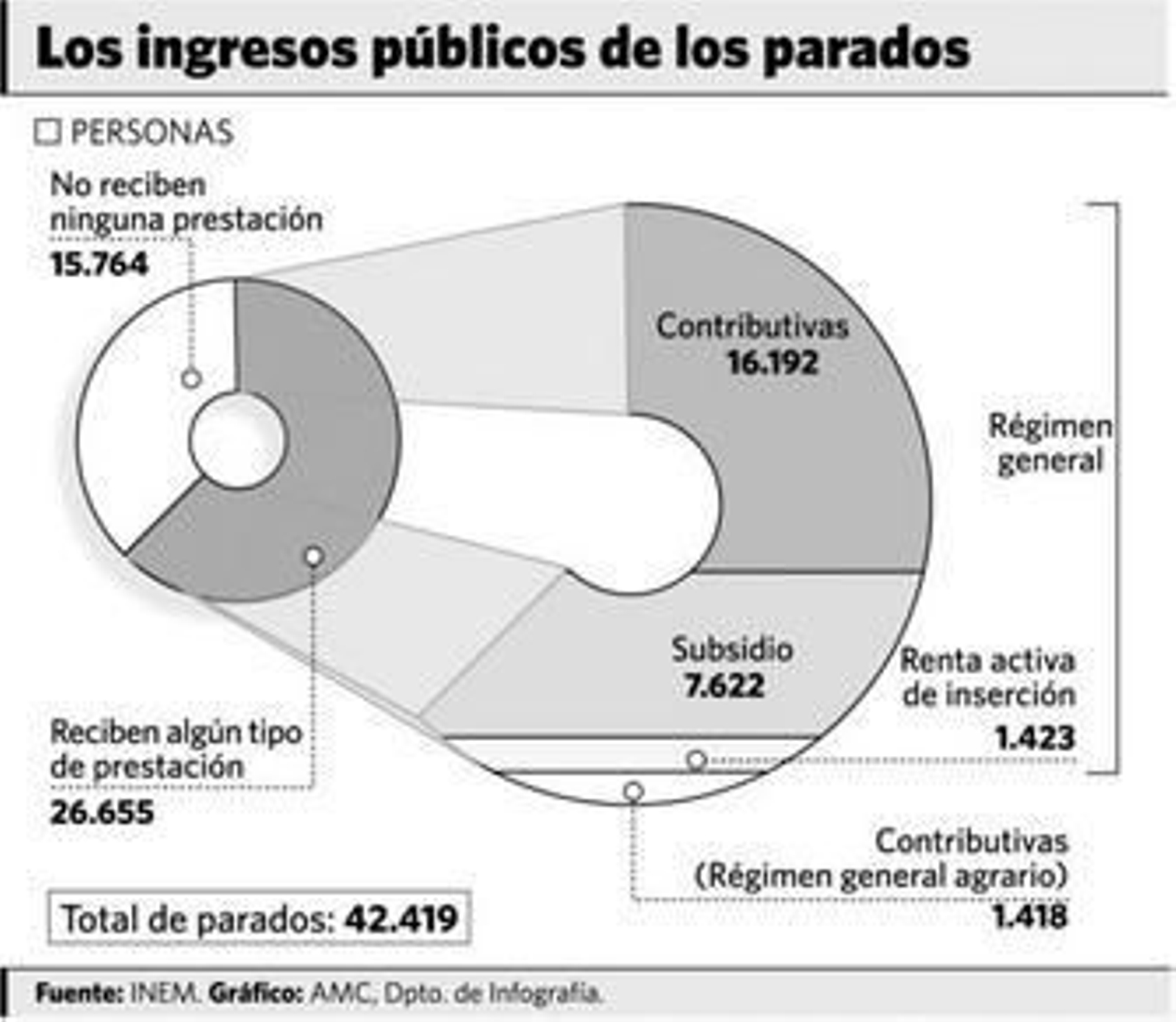 Sólo cuatro de cada diez parados cobran la prestación contributiva (alrededor de 800 euros), dos de cada diez reciben un subsidio o ayuda de 400 euros al mes, para dejar al resto sin ingreso alguno