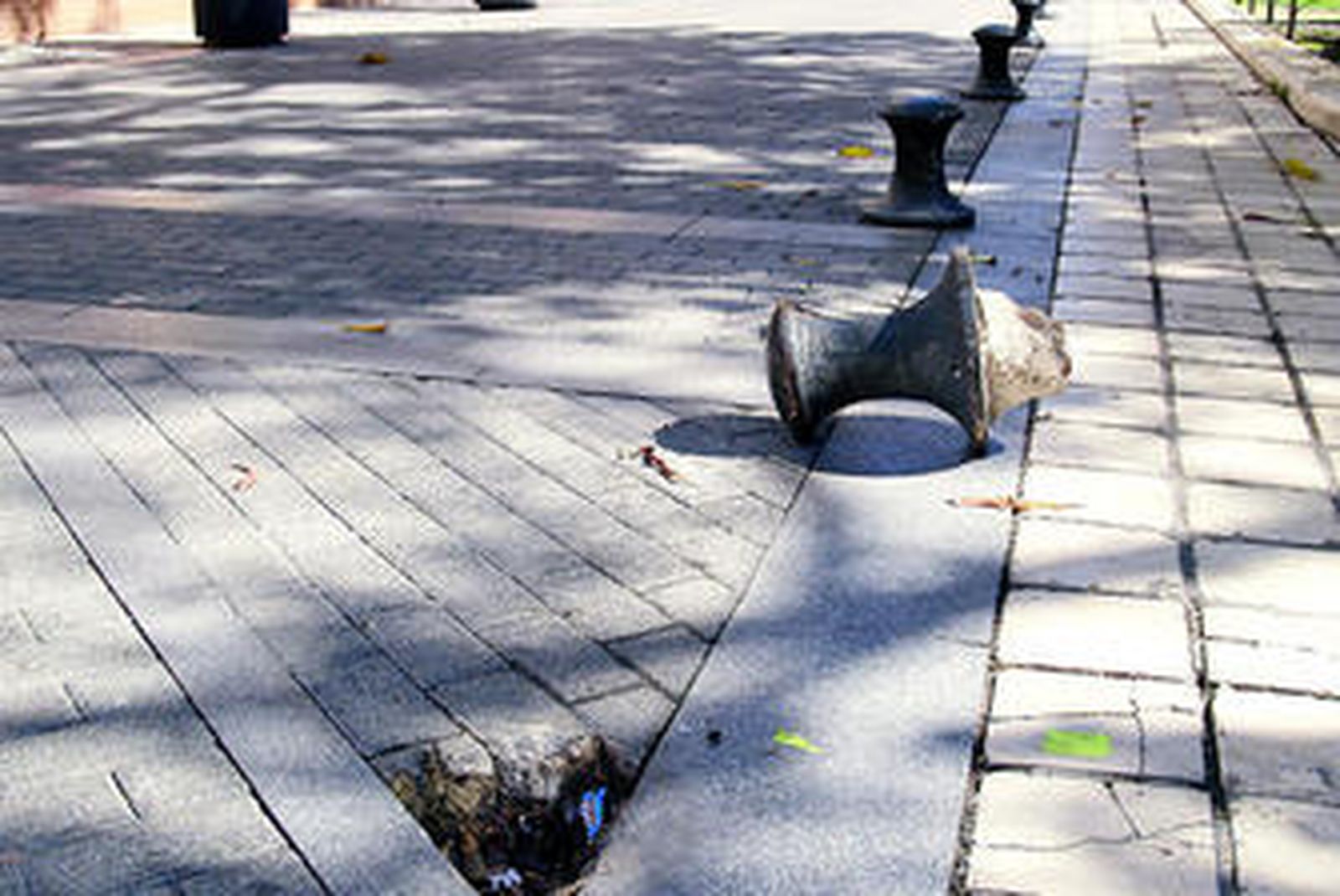 El peligro acecha en la plaza Niña de la capital onubense. El ciudadano puede correr peligro por partida doble. Un pivote de la vía capitalina está arrancado del suelo y deja una cavidad en el suelo que perfectamente podría hacer caer a cualquier ciudadano. Pero no sólo eso. El pivote, con su base de cemento incluida, se encuentra en medio de la calle contribuyendo a que alguien pueda tropezar y dañarse con él.