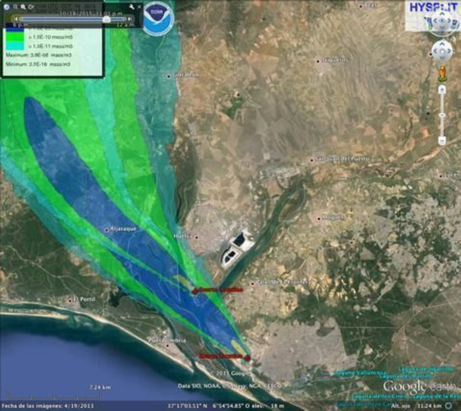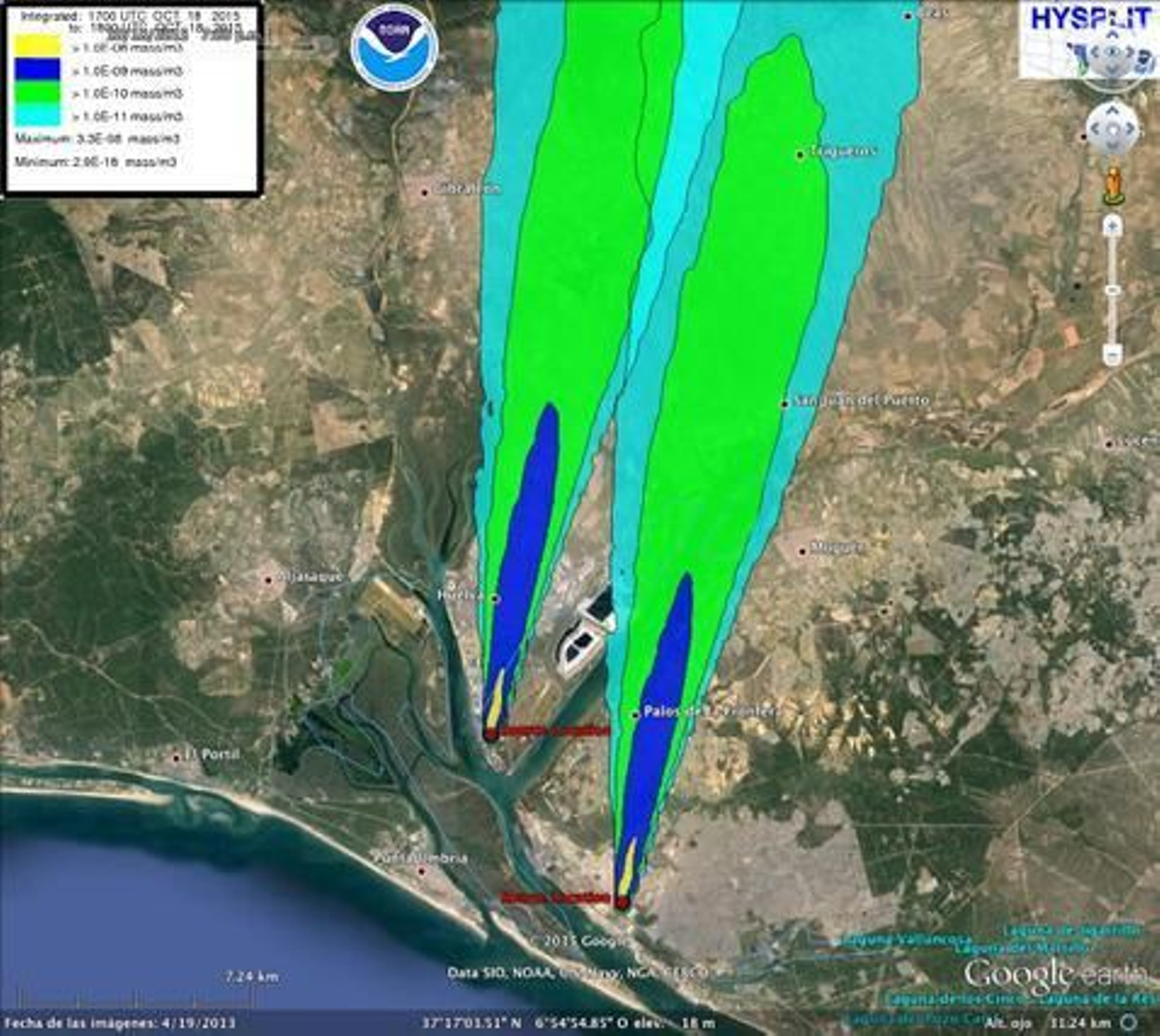 La dificultad estriba en el gran número de focos emisores existentes. El modelo realizado la Unidad Asociada CSIC-Universidad de Huelva Contaminación Atmosférica, de la que De la Rosa es investigador principal, elige un punto de cada uno de los polígonos a diferentes alturas para conocer la posible fumigación industrial en la ciudad, aunque sin tener en cuenta datos de funcionamiento de las empresas en la simulación. Sólo busca representar el patrón de conducta de los penachos industriales de cada una de las zonas en los días 16 y 18 entre las 20:00 y las 24:00, en las que más se notó el olor. Al introducir las variables meteorológicas y atmosféricas se recoge el movimiento antihorario de esas plumas, primero con el impacto de los de Punta del Sebo y Nuevo Puerto en la ciudad y después con el desplazamiento de la pluma de Punta del Sebo hacia Corrales-Bellavista, e incluso Aljaraque al comienzo de la madrugada. Y ambos se solapan "pudiendo superponerse al mismo tiempo los contaminantes de ambos polígonos industriales al oeste de la ciudad". Algo que hace reflexionar al especialista sobre la dificultad de medir el impacto acumulativo de todos los penachos procedentes de ambos núcleos industriales. Y que contrasta con la posición expresada hasta ahora por la Junta de Andalucía, que circunscribe al Polígono Nuevo Puerto el origen del olor.