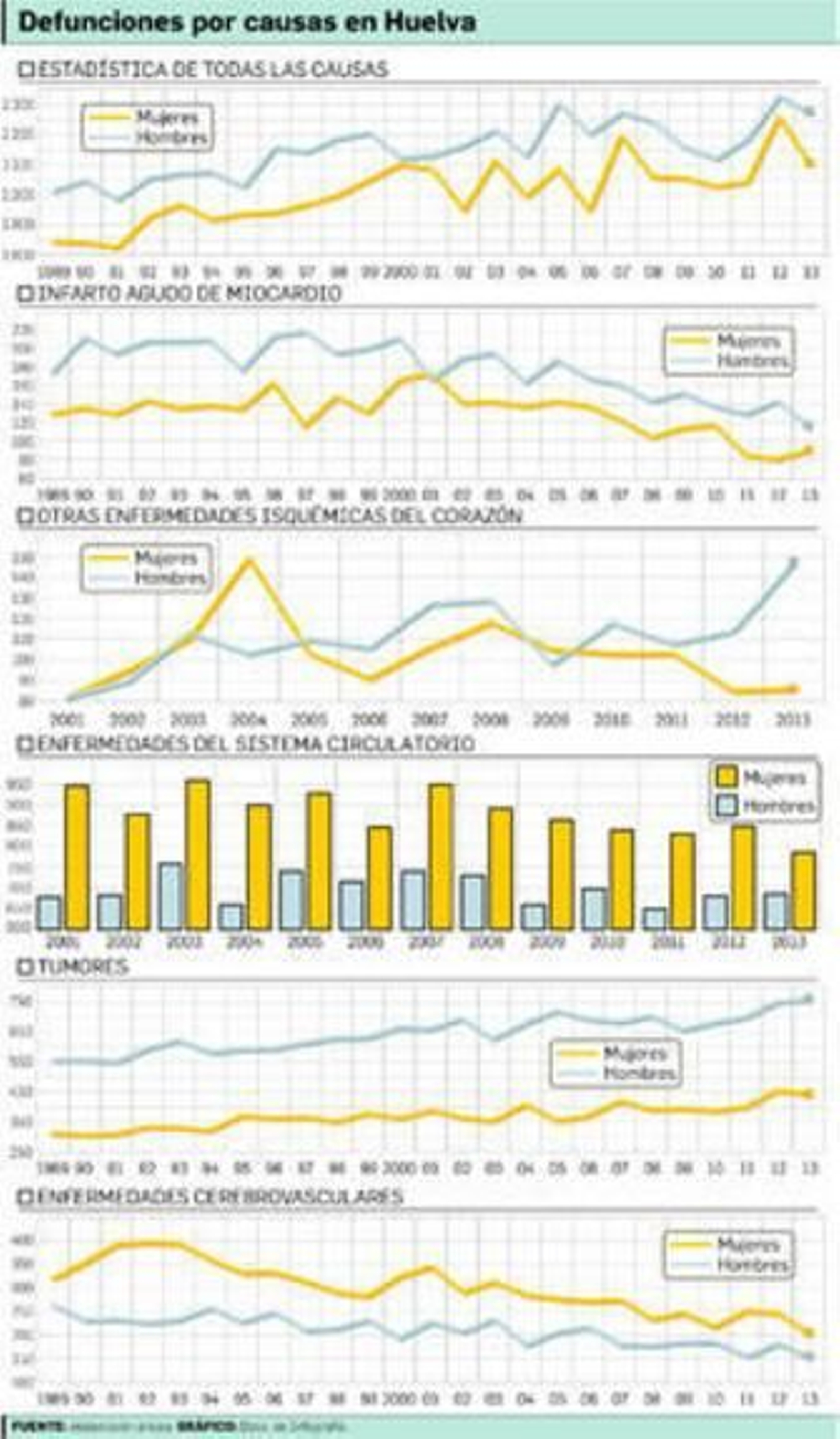 La principal causa de muerte de la mujeres de la provincia de Huelva en 2013 guardó relación con algún fallo en el sistema circulatorio. Sin embargo, la tendencia de los últimos 25 años ha sido a la baja y su descenso ha sido espectacular. Si en 1997, el peor año de la serie, morían en la provincia 1.007 mujeres (una media de tres al día), en 2013, el número de fallecidas ha quedado reducido a 786, el mejor registro de los 25 últimos años.
