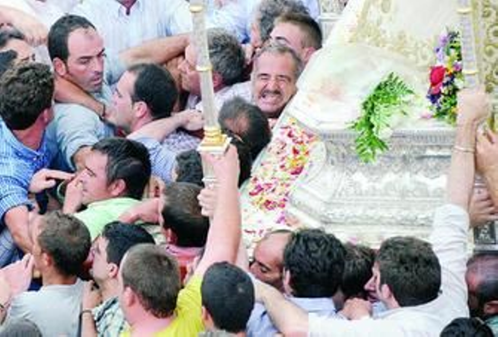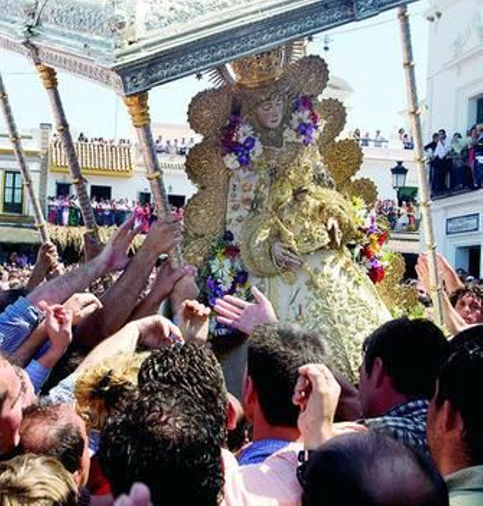 La jornada comenzaba en ese instante impreciso de cada lunes de Pentecostés. Nadie sabe la hora. Nada hay escrito. Todo es intuición. El momento en el que Almonte rompe la espera es siempre una incógnita cuya resolución se presiente. Este año fue media hora después que el pasado, el próximo, Dios sabrá. Apenas había llegado el nuevo Simpecado de la Matriz al presbiterio cuando los almonteños volvieron a pintar una estampa tan reiterativa como cierta. La Virgen aparecía sola en su altar. Ni un mero exorno. Sola ante la masa enfervorizada que llevaba contando las horas, los minutos que separan un Rocío de otro. Ya está en los brazos de sus hijos. Ya tienen las televisiones nacionales su imagen para el resumen más simplista de la fiesta.
