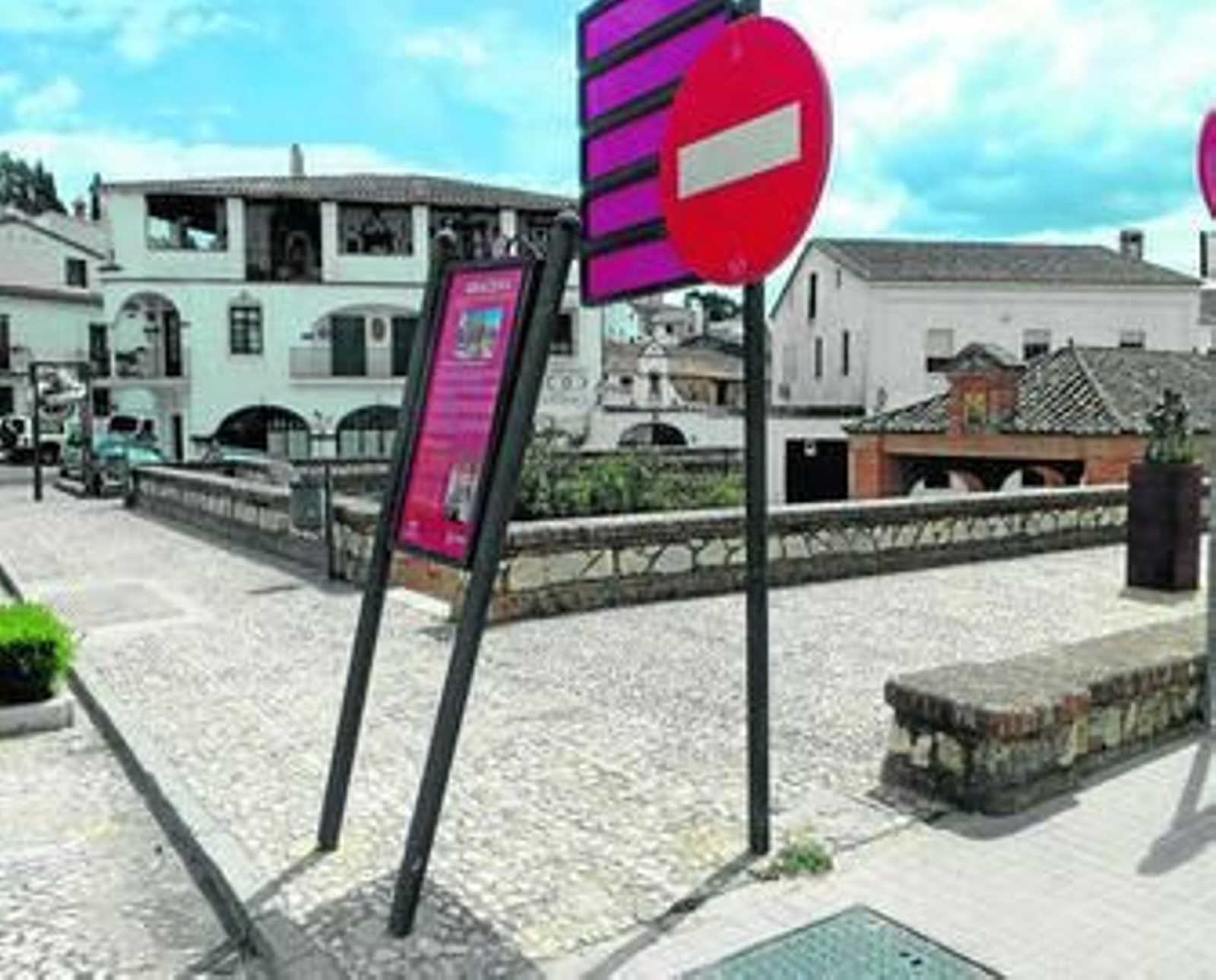 Esta señal turística ubicada en la plaza de San Pedro, uno de los lugares más visitados de Aracena por su cercanía con la Gruta de las Maravillas, está inclinada hacia atrás. Quizás algún conductor ha realizado unas maniobras incorrectas y la ha golpeado con su vehículo. Aunque podría reposar en una señal que tiene justo al lado si llegara a tumbarse aún más, bien merece ser colocada derecha para su perfecta lectura y su buena imagen.