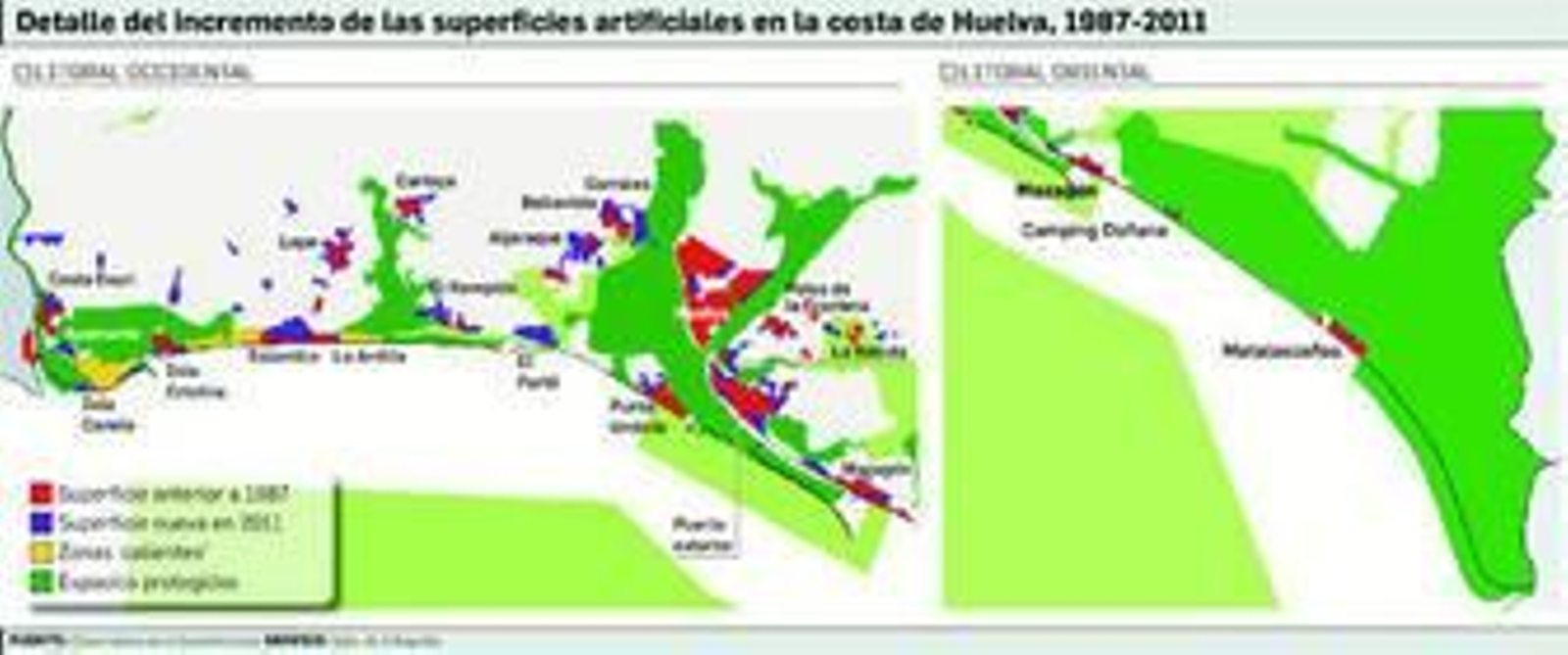 Queda constatado que precisamente en estos 25 años en los que se centra el informe, desde 1987 inclusive, por tratarse del primer año con datos disponibles, coincide con la mayor actividad constructora. En el caso de Huelva, por ejemplo, se recogen los nuevos núcleos costeros de Islantilla, Nuevo Portil, Costa Esuri, y los desarrollos de El Rompido, Isla Canela y Punta del Moral o también El Portil y Punta Umbría, además de Matalascañas y su nuevo campo de golf.