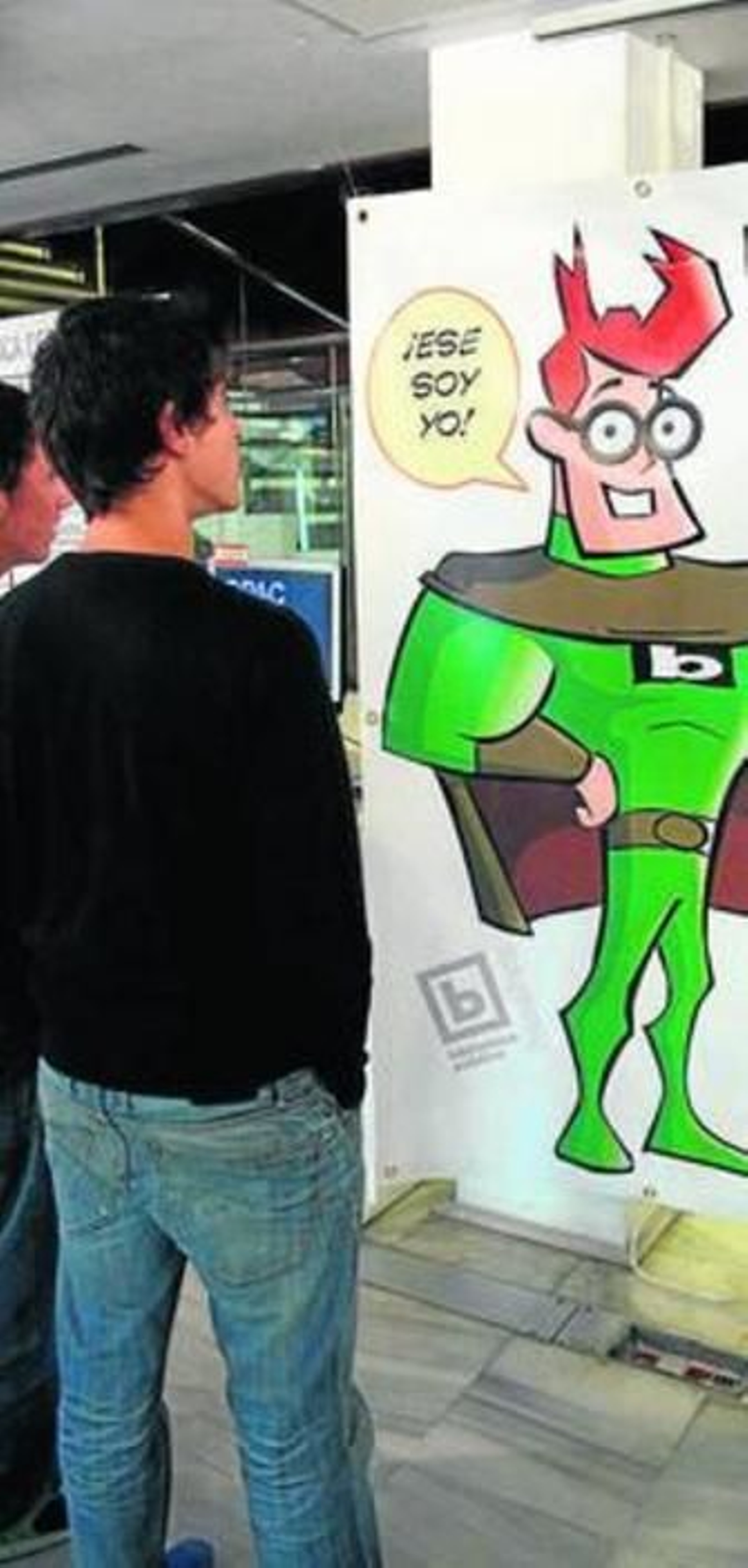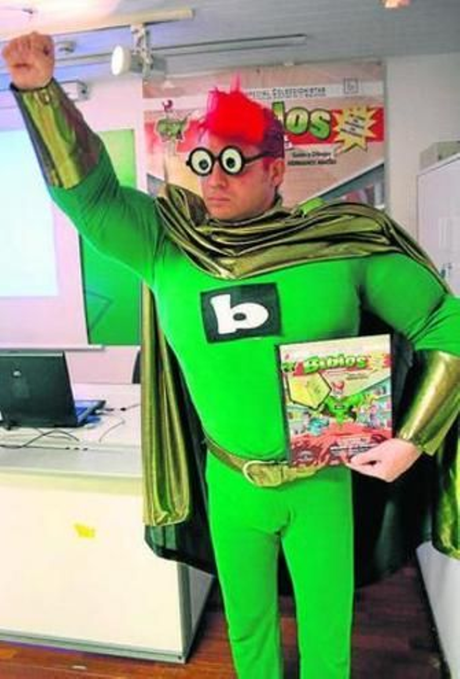 Superman, Batman, el increíble Hulk, Helboy, Iron Man, el Caballero Oscuro, Spiderman, el Capitán América... Un gran número de superhéroes ha formado parte de las viñetas de los cómics o han cobrado vida en la gran pantalla. Desde ayer hay uno nuevo que se suma a la lista. Es onubense, tiene ojos negros, pelirrojo, de 31 años, soltero, mide casi dos metros y pesa más de 100 kilos, usa gafas redondas, un traje y una capa verdes con una be en el pecho... Posee una gran fuerza, velocidad y vuelo pero su mayor poder es el conocimiento de todos los libros de la biblioteca, sus autores, personajes y tramas. Su nombre es Biblos, el superhéroe de biblioteca.