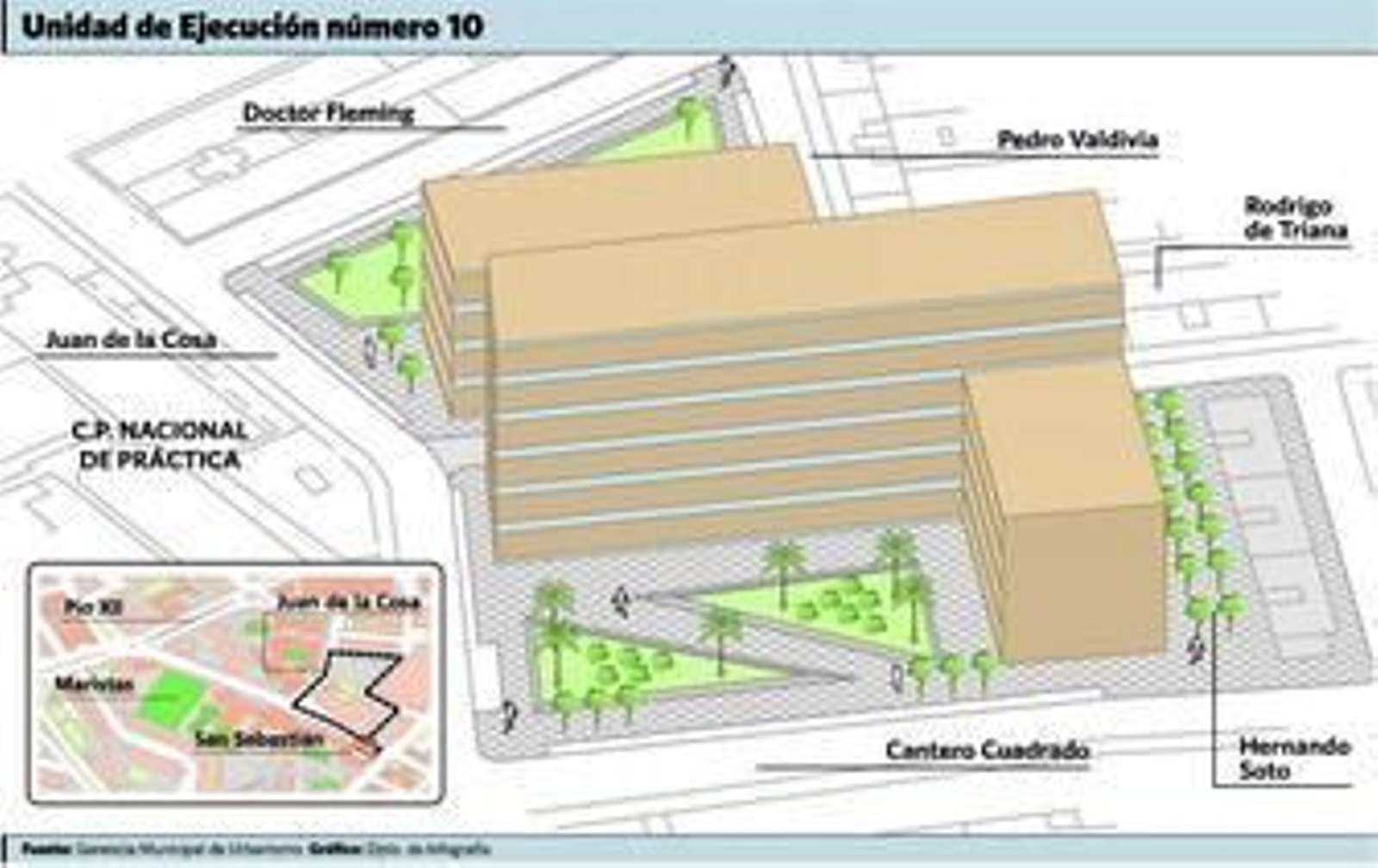 Los inmuebles, que actualmente se ubican en el espacio de actuación, serán demolidos, para a continuación reestructurar la zona de acuerdo a las necesidades existentes, dando prioridad a las zonas verdes. De los 9.406 metros cuadrados, distribuidos en doce parcelas, sólo se destinan a viviendas 2.607,68 metros cuadrados, el 27,7 por ciento de la superficie total, siendo el resto, el 72,3 por ciento para viario y espacios libres, concretamente, 4.174,44 metros cuadrados, el 44,3 por ciento, para espacios libres, y 2.076,43 metros cuadrados, el 22 por ciento, para la construcción de nuevos tramos de viarios. Otro de los objetivos de la Unidad de Ejecución es la vertebración de la zona a ordenar urbanísticamente con su entorno. De hecho se prolongará la calle Rodrigo de Triana para enlazarla con la calle Juan de la Cosa, será a través de un pasaje peatonal.