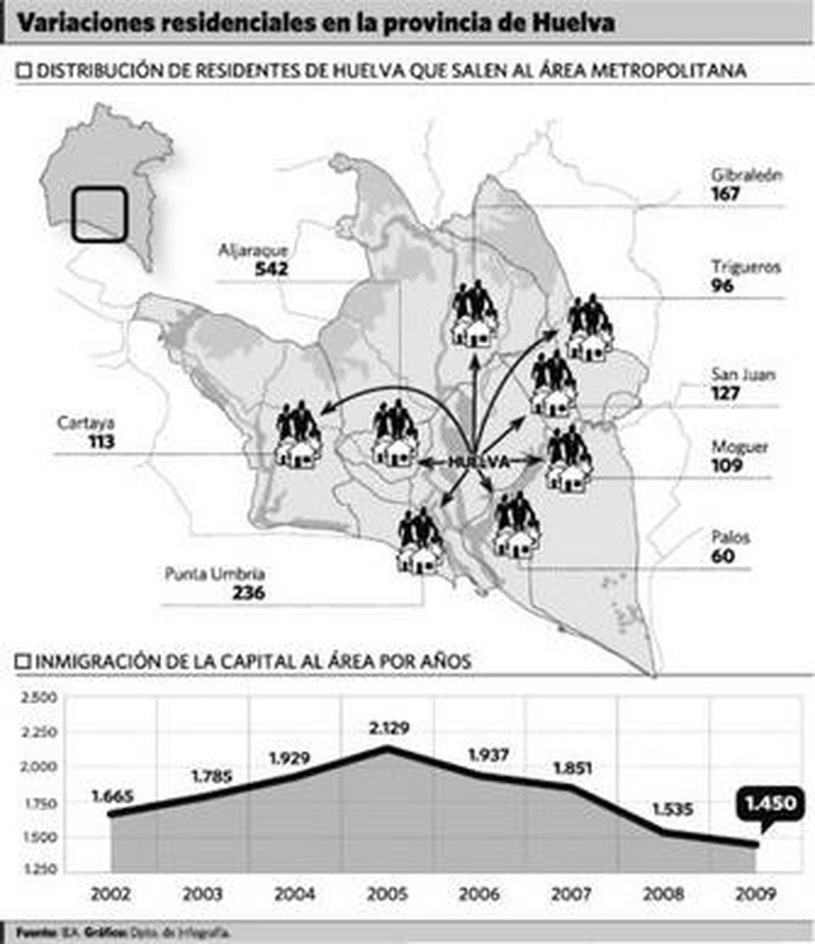 De momento, a la luz de este nuevo informe del IEA, Aljaraque sigue encabezando el ranking de los destinos preferidos, al ser el municipio más cercano a la capital y objeto de un desarrollo urbanístico exponencial. Un total de 542 vecinos cambiaron su residencia a esta localidad en 2009; 236 se mudaron a Punta Umbría; 167 a Gibraleón; 127 a San Juan del Puerto; 113 a Cartaya; 109 a Moguer; 96 a Trigueros y 109 a Moguer.