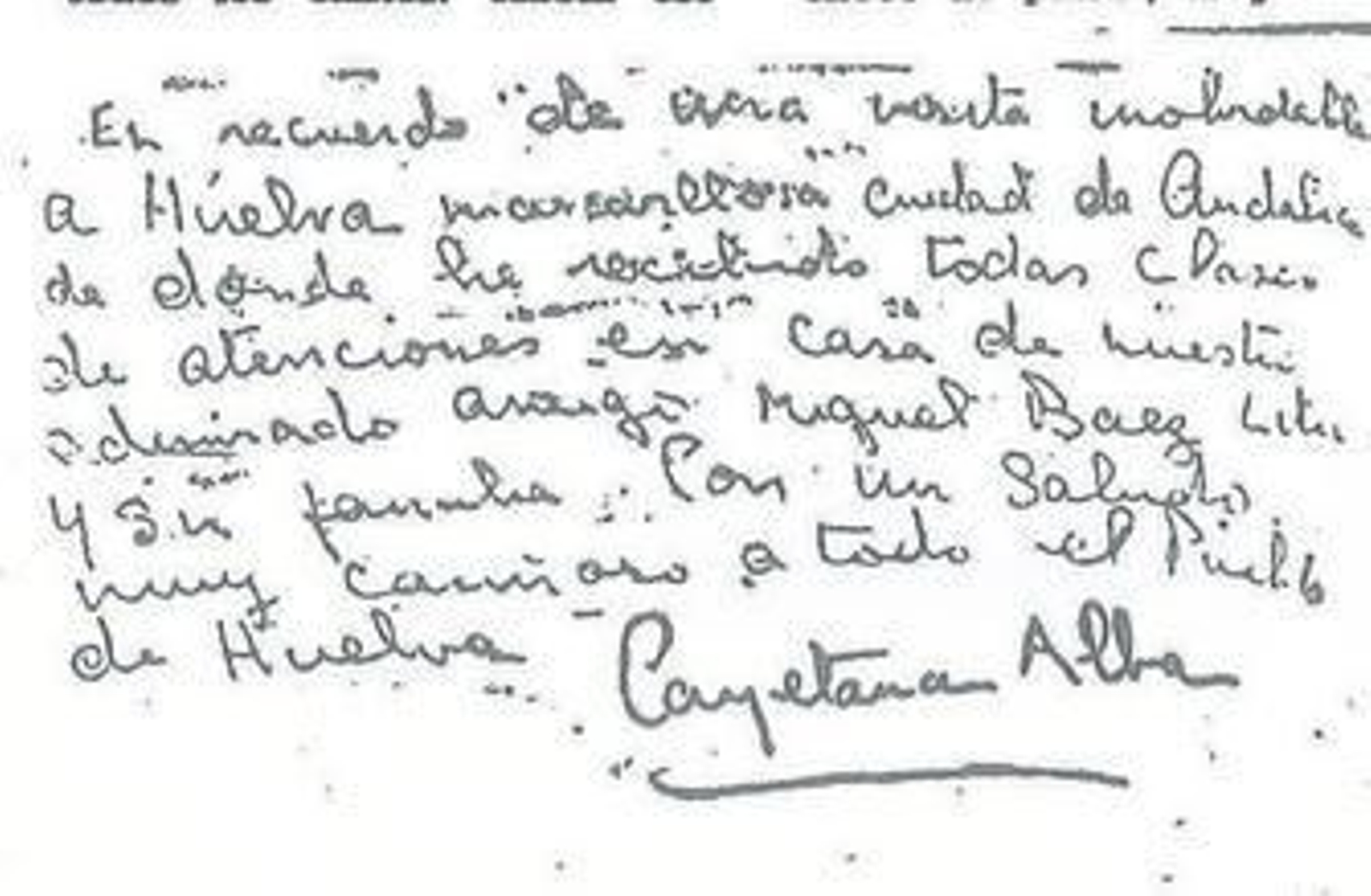Cayetana Fitz-James Stuart, duquesa de Alba, marquesa de Portocarrero y señora de Moguer, entre otros títulos nobiliarios, mantuvo una relación de afecto con la provincia de Huelva. De esos encuentros a lo largo de su vida se recuerda con bastante alegría los vividos en las últimas décadas, como fue la coronación canónica de Nuestra Señora de Montemayor. Una invitación que se le realiza por la vinculación de la Casa de Alba con Moguer de la que tenía su señorío. Concedido a Alonso Jofre Tenorio, el señoría continúo vinculado a la Casa de Portocarrero que lo engrandeció y convirtió en parte de un mayorazgo, una vez extinguida la rama principal de la Casa de Portocarrero, el señorío pasó a ramas colaterales, llegando finalmente a la de Alba en la persona de Carlos María Fitz-James Stuart y Palafox. Tras la abolición de los señoríos aquí se mantuvo la vinculación directa con Moguer por el patronazgo sobre el convento de Santa Clara.