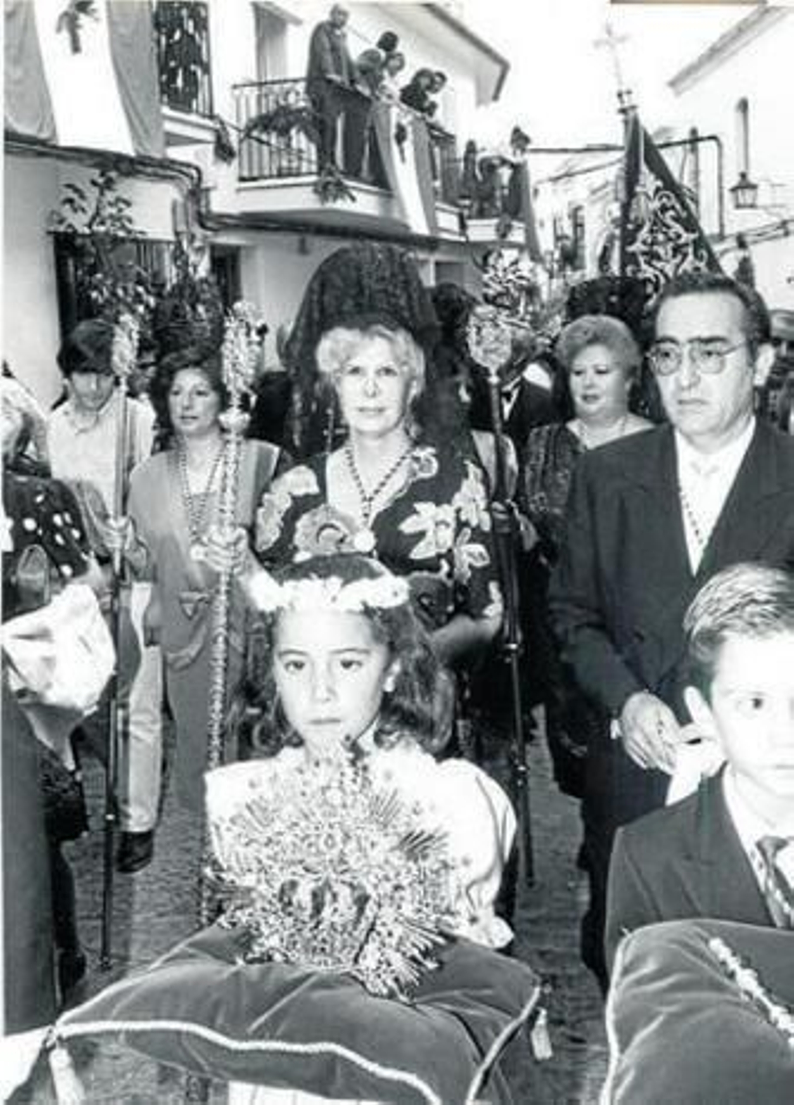 Aquel día Moguer lo vivió con sus mejores galas. Una jornada de fiesta desde la iglesia de Nuestra Señora de la Granada con la procesión de la Virgen hasta el lugar de su coronación. El recorrido por las calles de la localidad constituyó todo un acontecimiento. Exornadas las casas y el romero esparcido por las calles. En aquella comitiva iba Cayetana de Alba, que vestía con suma elegancia y belleza un traje negro estampado, con mucho color para un acontecimiento festivo como era la coronación canónica, que invitó a muchas miradas.