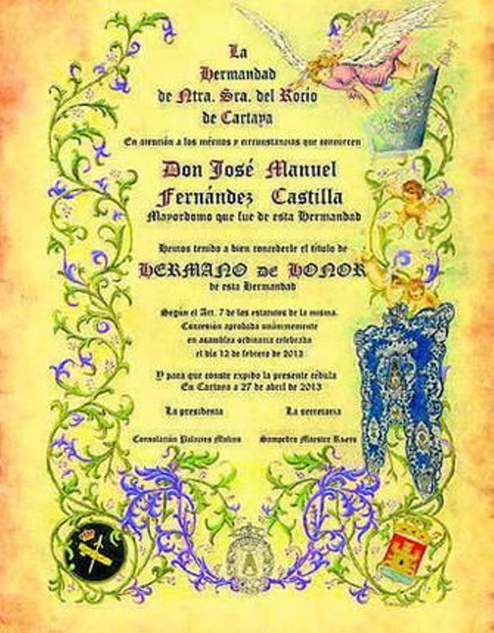 Por otra parte, la ornamentación y el colorido depende del tema, personaje o motivo de cada documento. "En alguno he realizado incluso el dibujo de la persona homenajeada, aunque esto entraña una gran dificultad y trabajo" apunta. Pero "por regla general, si el trabajo es para una hermandad, se suelen plasmar sus emblemas, escudos, banderas, estandartes o ángeles, normalmente enmarcados por una orla de hojas de acanto en tonos diversos". "En otras ocasiones -prosigue- se añaden dibujos emblemáticos de la zona de residencia del homenajeado enlazados entre los ramos que componen la orla".