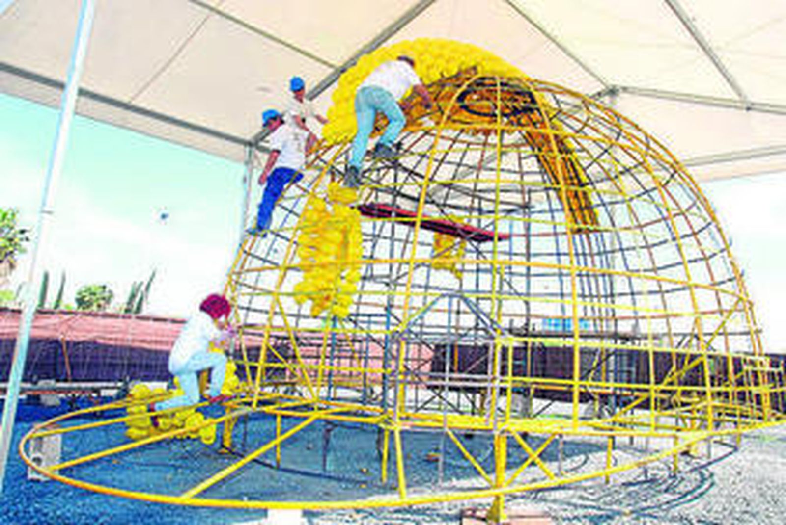 Desde el pasado mes de enero están trabajando en esta estructura que se encuentra bajo una gran nave preparada exprofeso para que se pueda construir la escultura en este año en el que hemos tenidos tanta lluvia; serán cuatro meses de trabajo. Aquí se está utilizando 1.600 kilos de hierro para estructura, 700 metros de pletina metálica, 300 tubos, y 8.000 electrodos para las soldaduras, además de los referidos tres mil cascos amarillos reciclados. El casco tiene unas dimensiones aproximadas de unos diez metros de diámetro si se incluye la visera y una altura interna de seis metros.