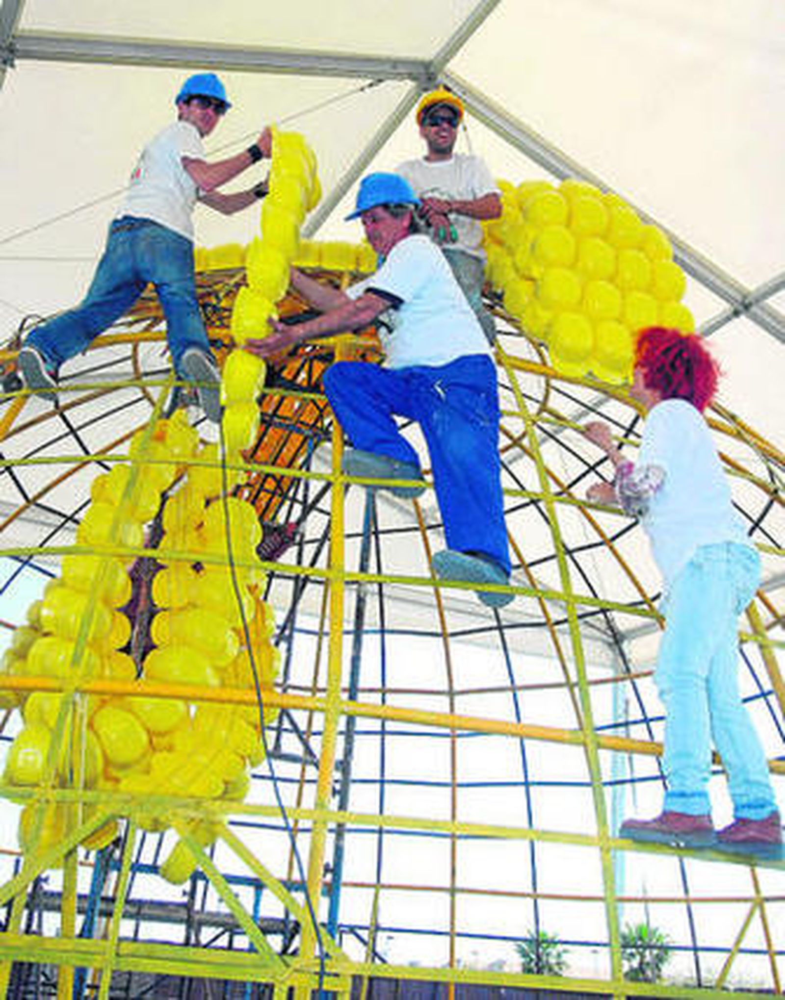 Se trata de una gran estructura metálica de hierros, algunos procedentes de un viejo invernadero. Este gran casco se cubrirá de otros cascos amarillos que se han hecho con material reciclado para este proyecto. "Intentaremos que sea el casco más grande del mundo, donde cada una de sus cédulas sea otro casco y así hasta unos 3.000", señala Rafael Mélida.