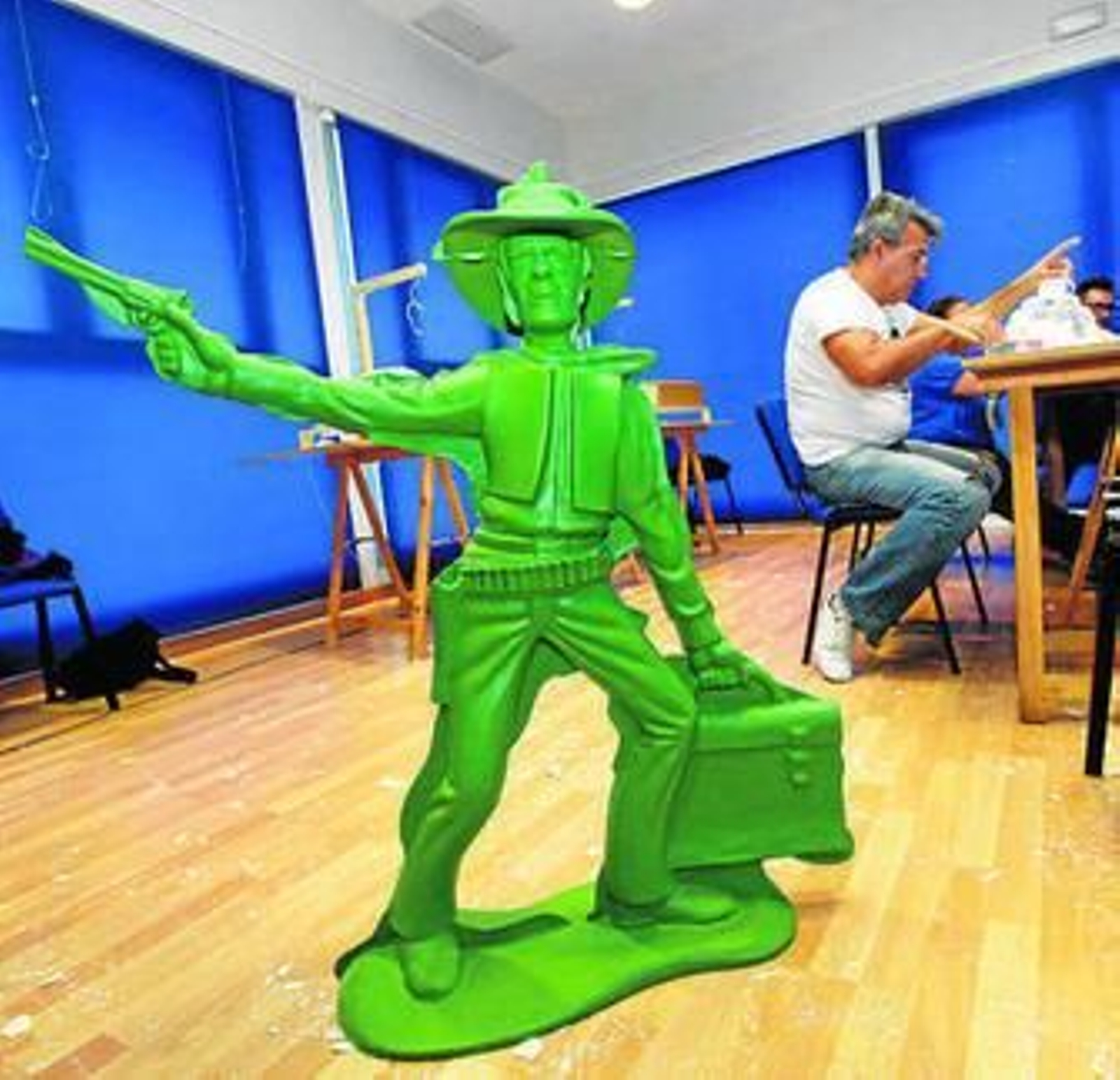 Una vez que el corcho estaba modelado, el siguiente paso fue pulirlo para seguidamente proceder a su revestimiento para endurecerlo. Unos optaron por el papel o cartón fallero y otros por el poliuretano, obteniendo distintos tipos de textura. Los primeros, más lisa, y los segundos, más rugosa. También se puede recubrir con resina acrílica, y para poder mostrar el acabado Garrido llevó una de sus esculturas, un cowboy verde.