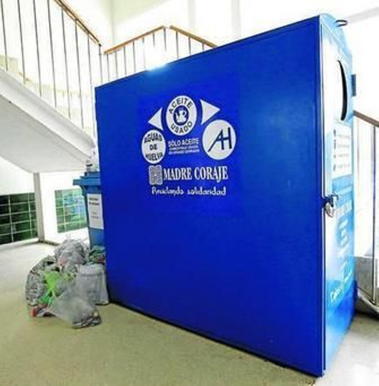 En 2008 Madre Coraje empezó a colocar contenedores para el aceite en centros educativos de Huelva para iniciar a los niños en la cultura del reciclaje. Se instalaron veinticinco en colegios e institutos, de los cuales diez se pusieron en la capital onubense. De ahí se extendieron por centros sociales, polígonos comerciales, mercados y la Universidad de Huelva. En algunas localidades, los Ayuntamientos permitieron ubicarlos en la vía pública.