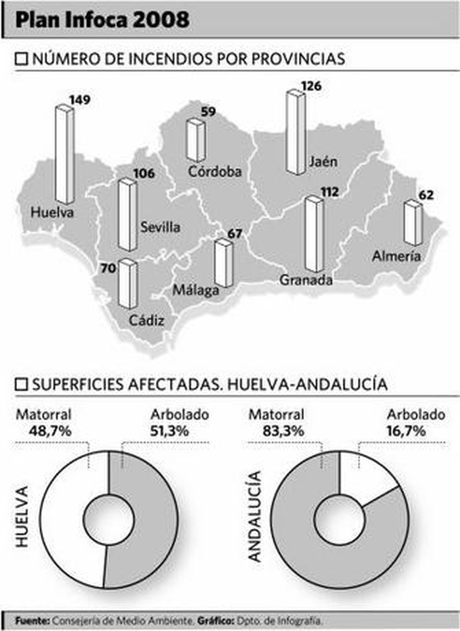 Frente a estos buenos resultados, la provincia de Huelva destaca en los datos globales del Plan Infoca 2008 por ser la que mayor número de intervenciones registró en estos diez primeros meses del año con respecto al mismo período de 2007. Huelva con un total de 149 incendios encabeza la lista de intervenciones de los efectivos contra incendios, le sigue de cerca Jaén con 126 actuaciones, Granada con 112 y Sevilla con 106. Con menos de un centenar de intervenciones se quedan el resto de provincias andaluzas, cerrando la lista Córdoba con tan sólo 59 fuegos detectados.