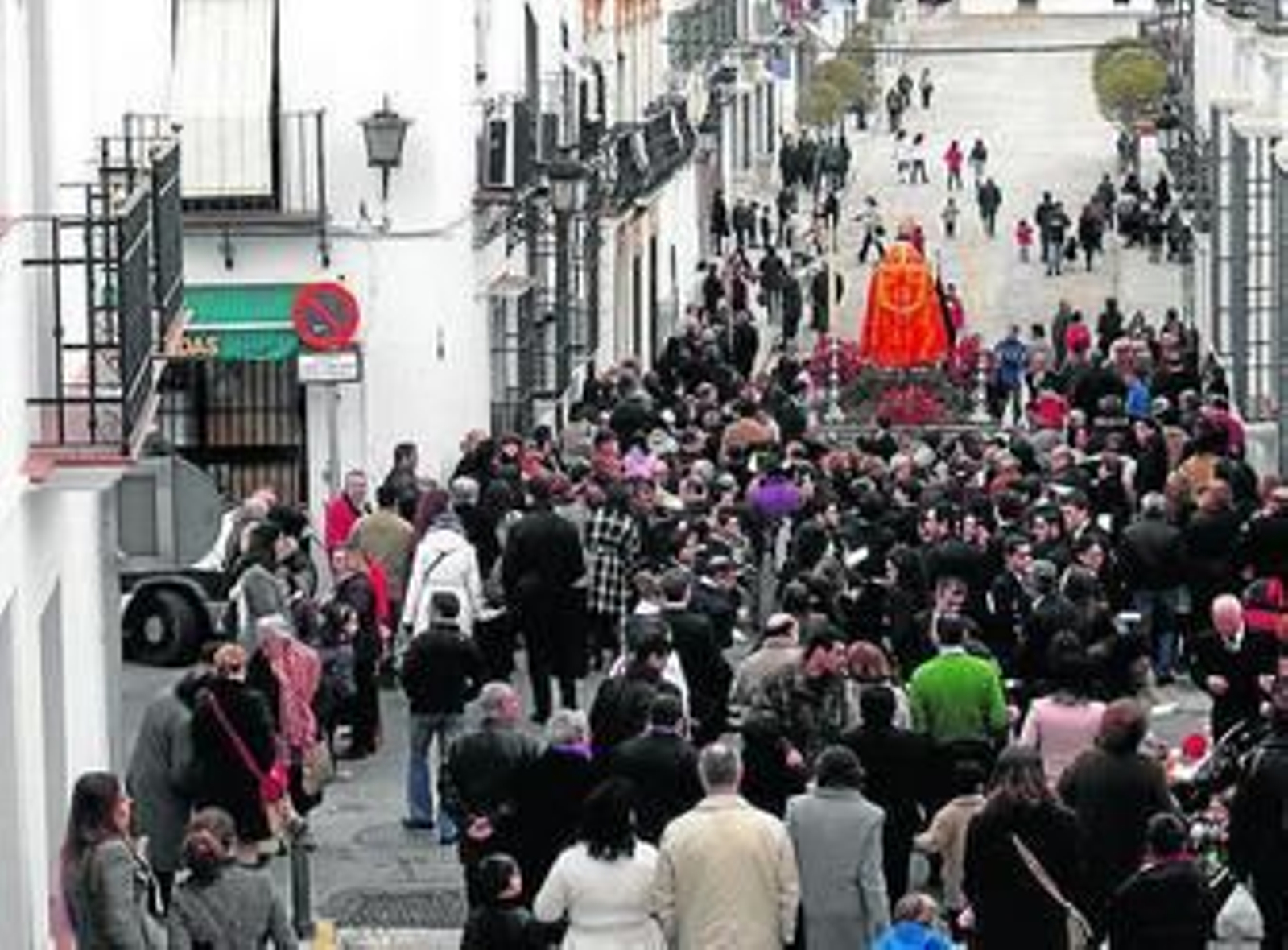 Pasadas las doce y media las campanas de la Parroquia de Nuestra Señora de la Asunción anunciaban la salida del Patrón portado sobre sus hombres por un grupo de jóvenes costaleros. De hecho ha sido la primera salida tras el arreglo, casi finalizado, de la Plaza Alta.