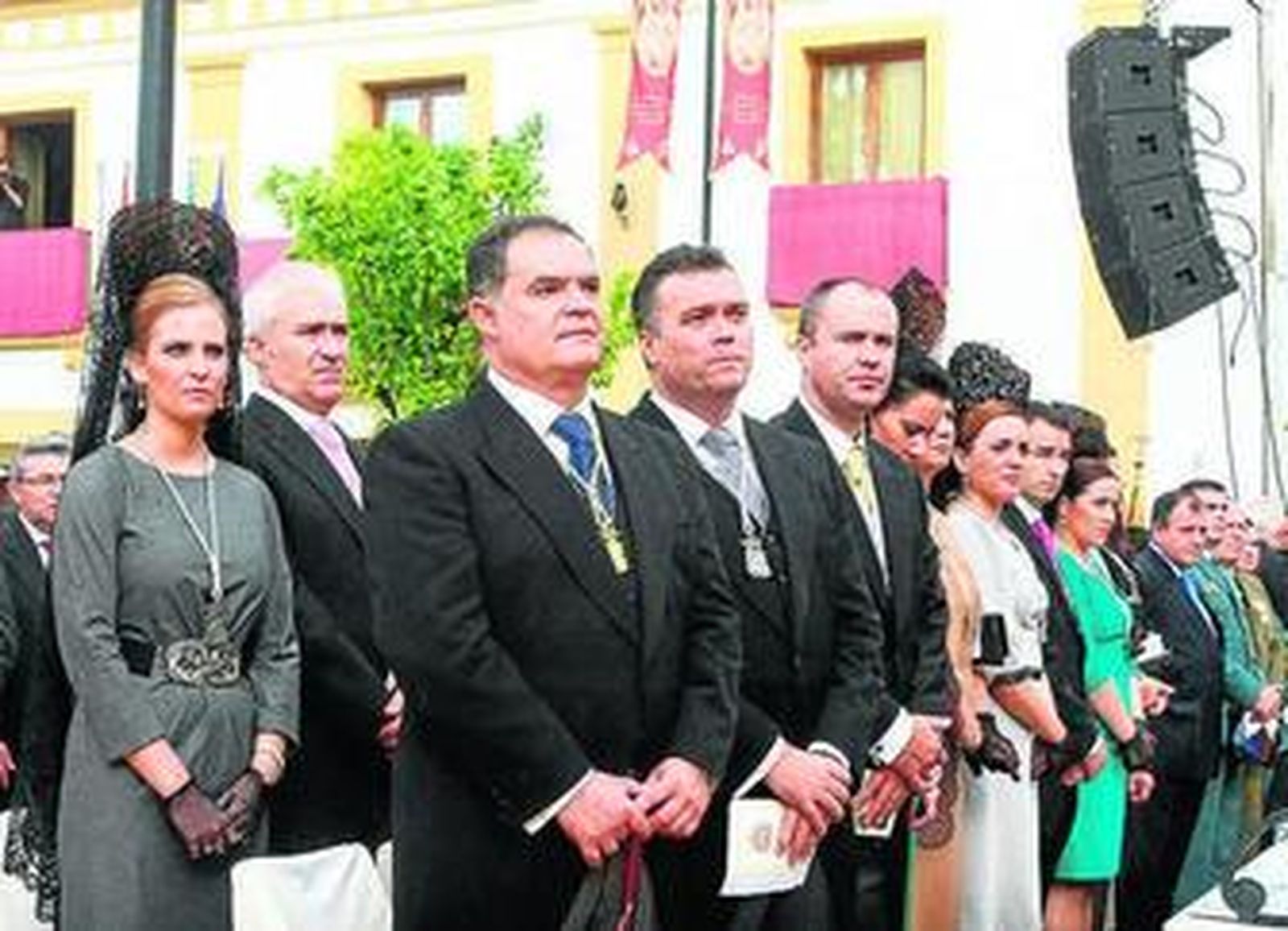 La lluvia hizo un primer acto de presencia. Fue nada más las hermandades invitadas al acto tomaron lugar en sus aposentos, lo que hizo temer la cancelación de la eucaristía y el traslado al interior de la Parroquia de San Juan Bautista, que hacía de telón de fondo mostrado la señera portada de un templo que pretendía hacer de anfitrión si la llovizna persistía. A penas pasaron cinco minutos y los cielos volvieron a despejarse, ocupando nuevamente sus asientos los pocos ciudadanos que no tuvieron fe en que el sol volviese a conquistar los cielos.