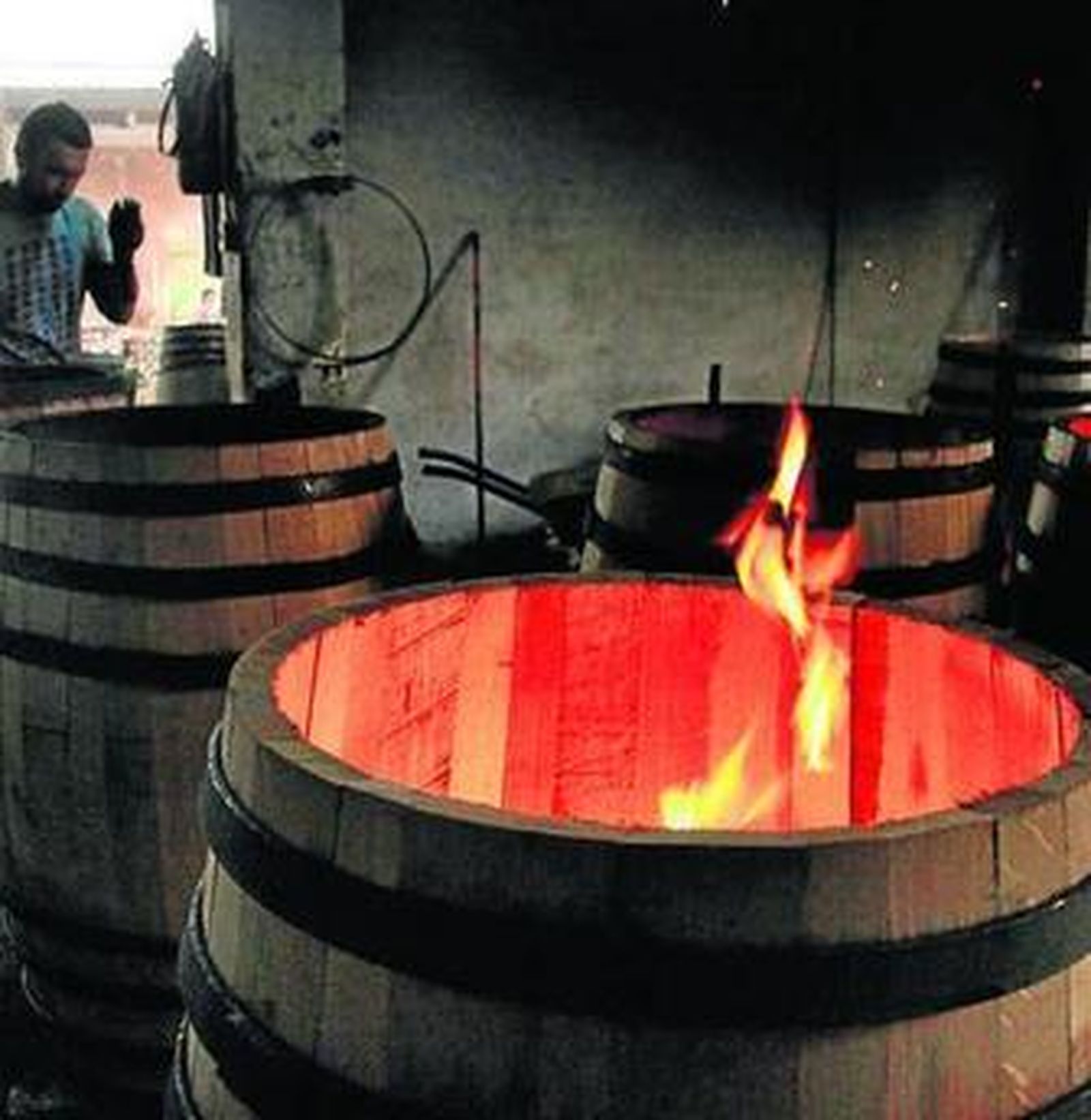 En este punto de la cadena de montaje si que se ha avanzado. Unos termómetros pinchados en la madera permite conocer en todo momento este parámetro. Antiguamente el tonelero calibraba el punto óptimo por el sonido que producía la madera al ser golpeada. Salas recuerda que cuando el martillo castigaba las tablas, si el sonido devuelto es hueco significaba que estaba húmeda, mientras que contra más seca se encuentre más se asemejará al tañido de una campana. Con la materia prima maleable se procede a su planeado, vaciado y tallado de la duela para lograr ese interior en forma cóncavo y su 'espejo' en forma convexa. Luego la juntadora labra corta longitudinalmente los extremos hasta lograr la forma más ancha en la zona de la barriga del tonel.