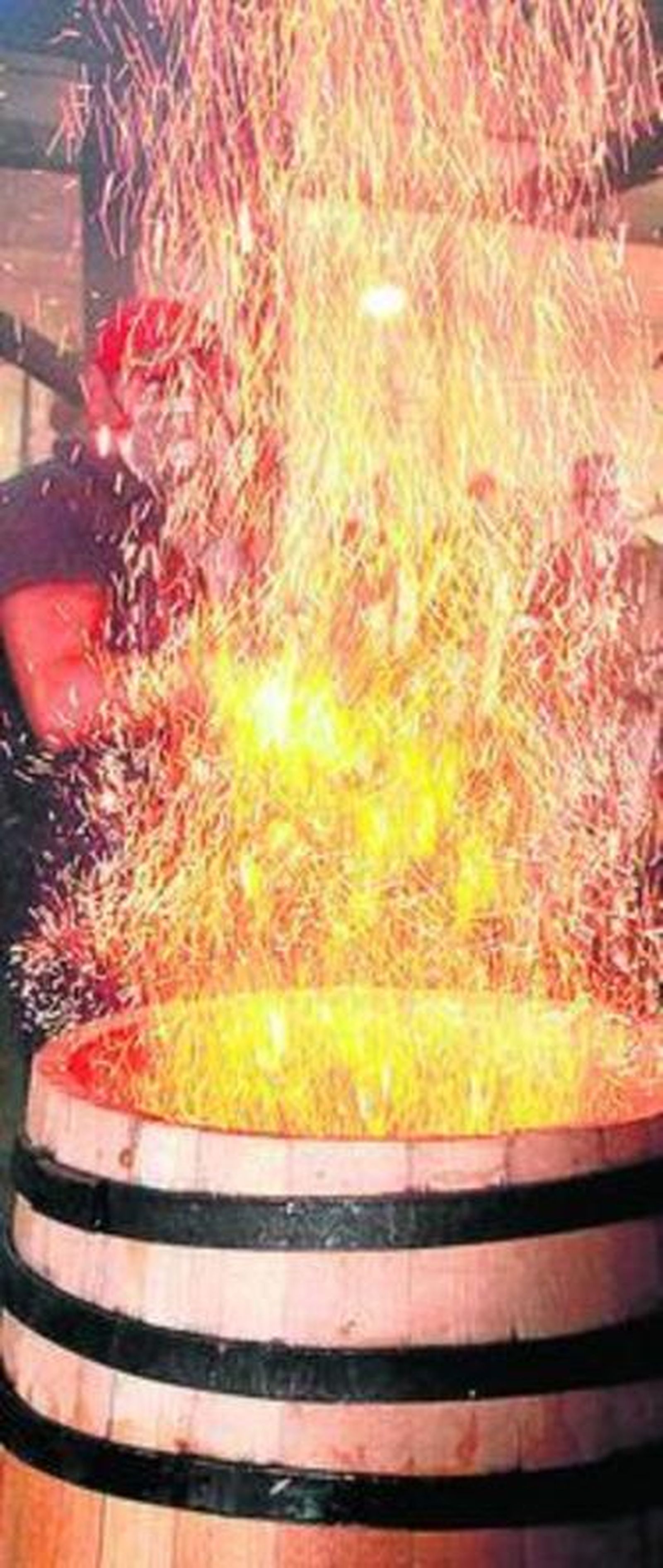 Toda esta producción tendrá que esperar al amanecer para que la madera se enfríe y mantenga su escultural silueta. A renglón seguido se le aplican los aros galvanizados de 1,4 centímetros de grueso y cuatro de ancho, se le aplica el fondo y una capa de arcilla limpia. Sala añade que en otras zonas de España se utiliza pasta de centeno, aunque tiene el inconveniente de que la porosidad de la madera puede hacer que esta se rezume y atraiga a la polilla.