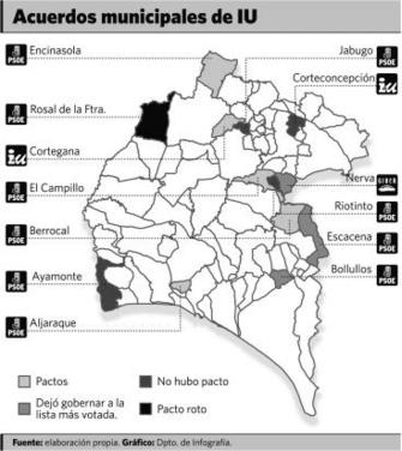 Después de dos semanas de intensas de negociaciones, IU logró sentarse con el PSOE en seis equipos de Gobierno dando lugar a un Ayuntamiento estable en Berrocal, Encinasola, Rosal, Cortegana, Aljaraque y El Campillo. Además en otros dos pueblos, Bollullos y Escacena, se dejó gobernar al PSOE como partido ganador en las urnas.