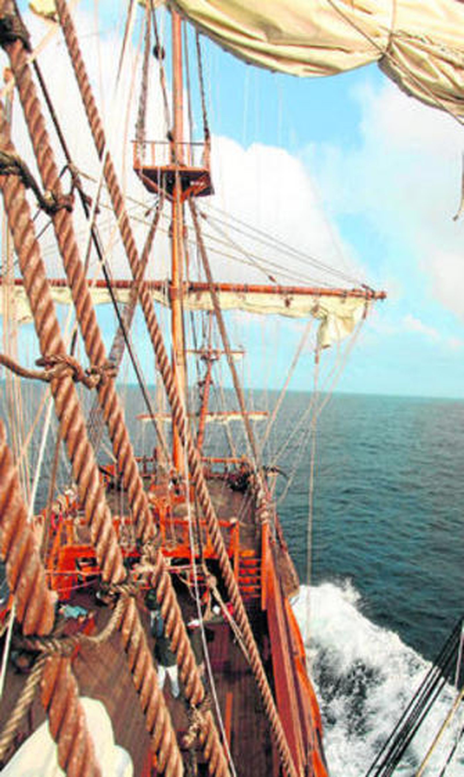 El galeón navega a una velocidad media de seis nudos y emplea toda una jornada en bordear la Costa de la Luz. Los tripulantes de pesqueros y barcos de recreo se agolpan embobados en la borda cuando se cruzan con el velero de madera y paños cuadrados de película de piratas. Al anochecer, los gigantes mercantes modernos cargados de contenedores salen lanzados del Estrecho en fila hacia el saco del Mediterráneo, como si de una autovía se tratase. A José Viñas, de los más jóvenes, le toca guardia con varios compañeros.
