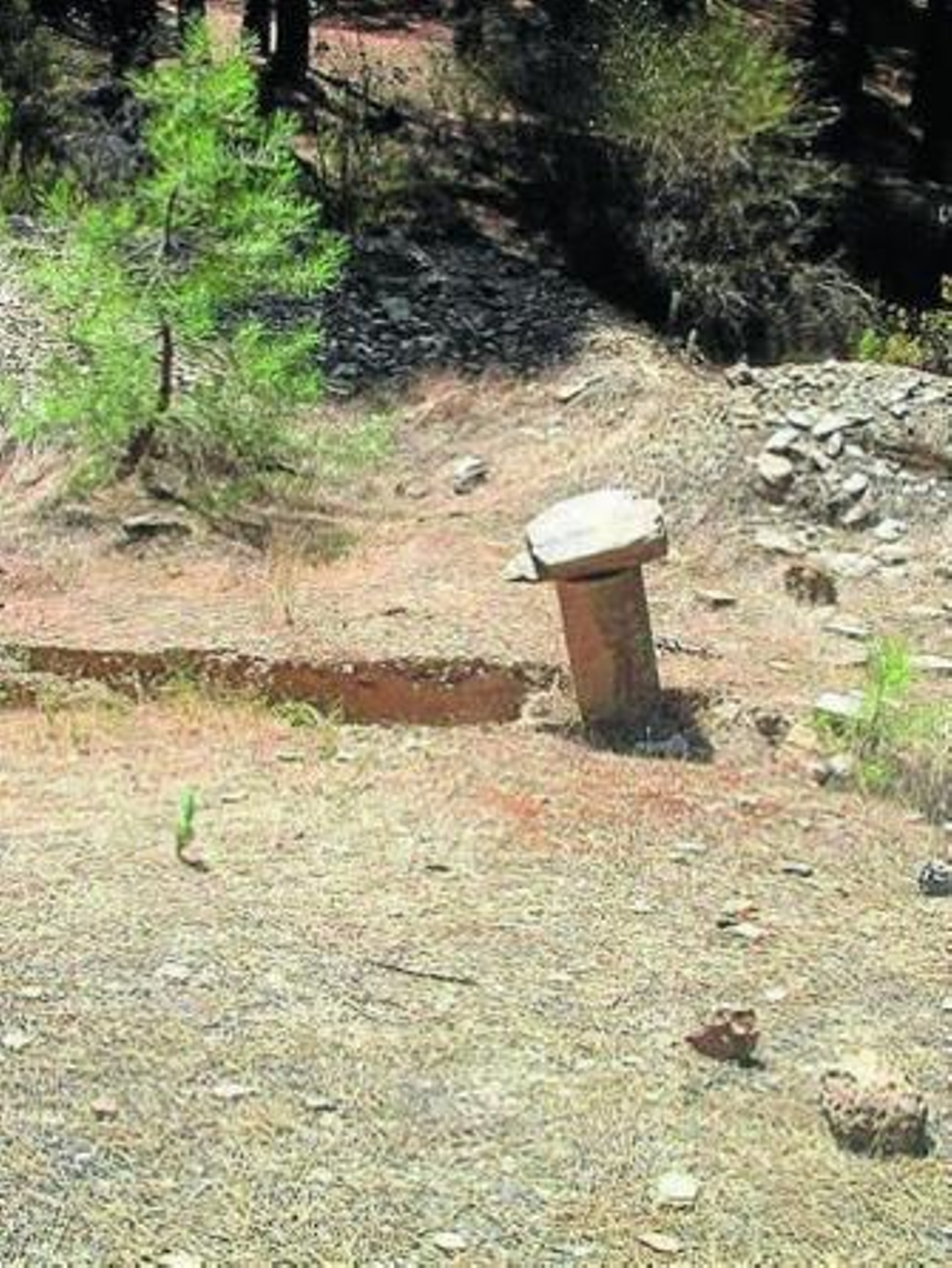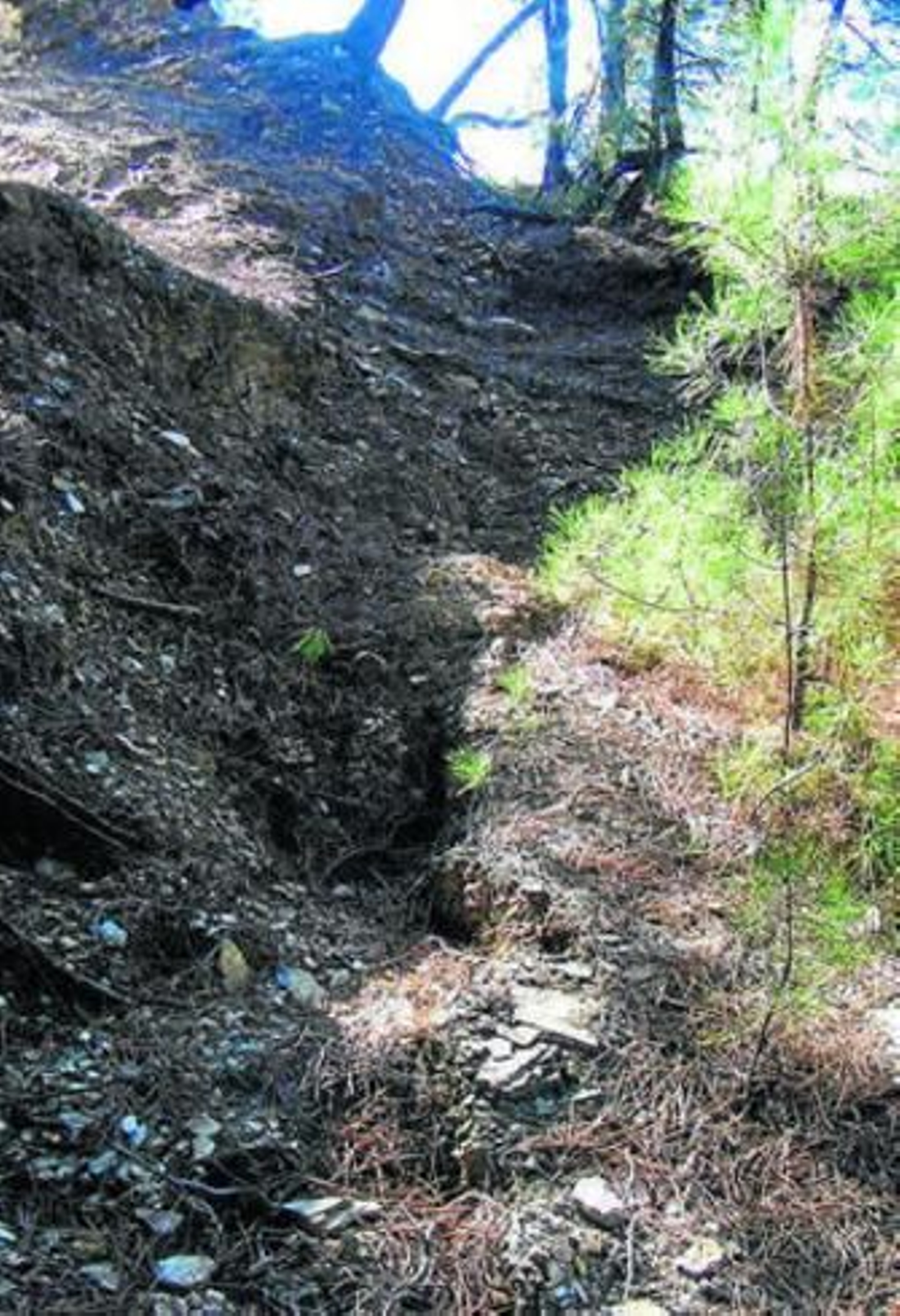 Una segunda grieta tiene unos 100 metros de longitud pero va acompañada de un sucesivo agrietamiento y deterioro del terreno en paralelo, rasgando un pinar que bordea la pista que comunica Cerro Colorado con Pozo Alfredo y el mirador de la Corta.
