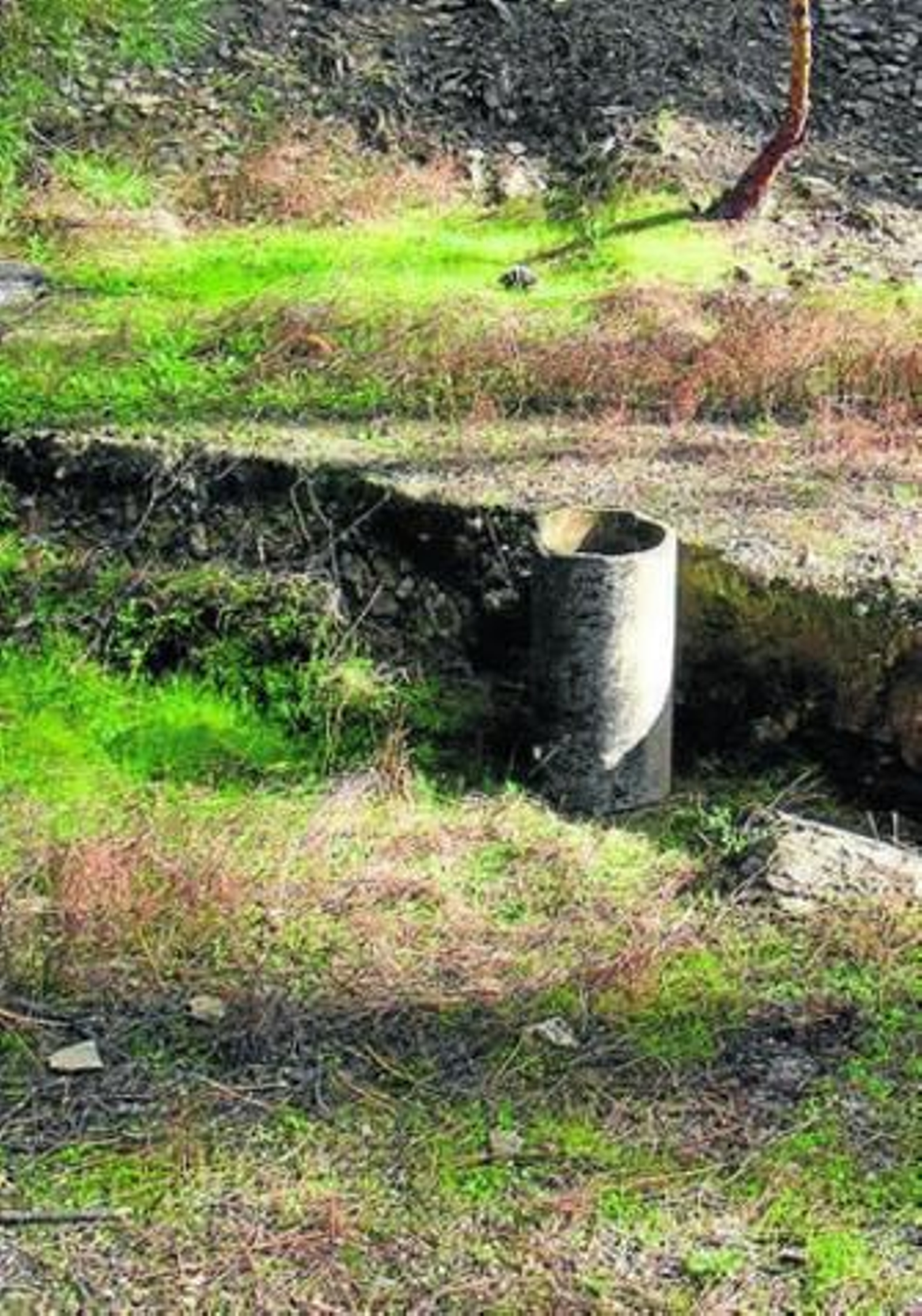 El desgarro existente en el terreno ha provocado el curvamiento y la caída de árboles al quedarse sin suelo que los sostenga. En esta zona se encuentra el vacie mineral El Paraguas. Su misión precisamente era la de proteger la Corta de las escorrentías de aguas en tiempos de lluvia. De la zona se llegaron a extraer hasta 400.000 toneladas de tierra para tratarla en la planta de oro y plata en 1997.