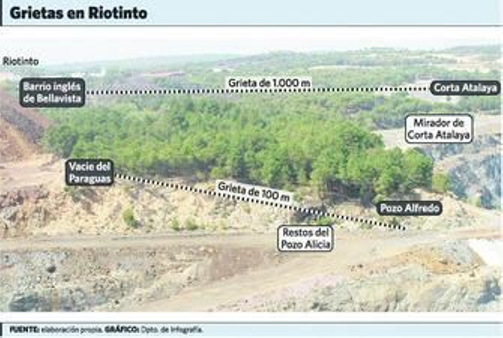 El abandono y la falta de manejo de las masas de agua de mina agrietan el entorno del pueblo. Dos enormes socavones, de mil y cien metros de longitud, discurren entre Corta Atalaya y el barrio inglés de Bella Vista.
