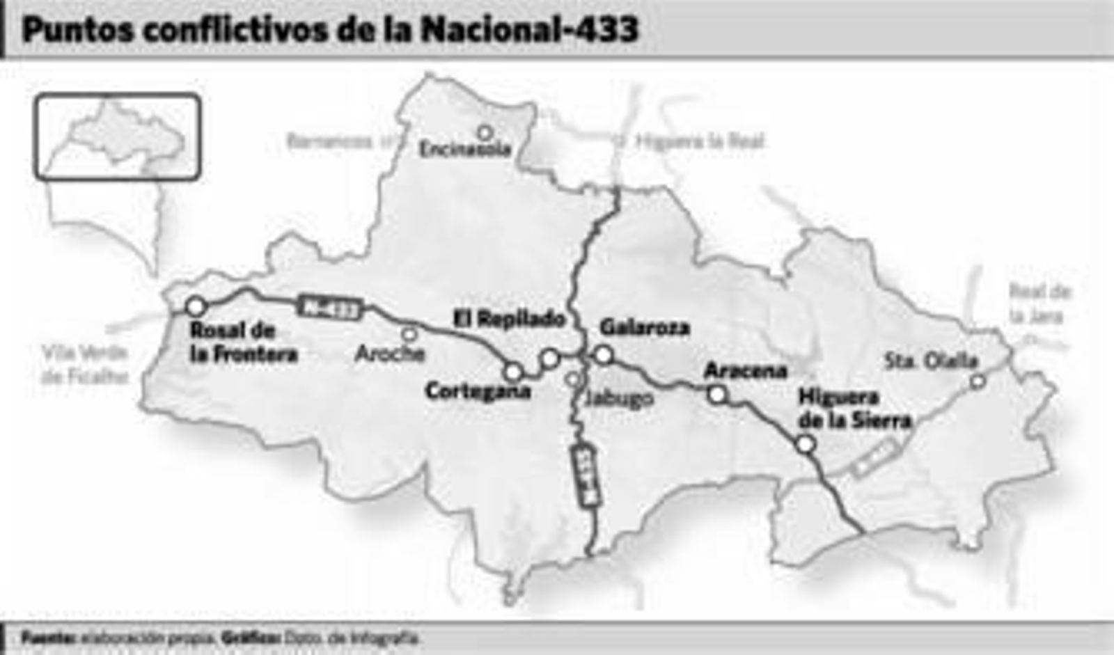 Una medida así podría paliar en buena parte los actuales problemas que presenta el paso de coches y camiones por esta carretera, si bien quienes apostaban por la construcción de una autovía de la Sierra no dejan de pensar que un proyecto así no llega a culminar las expectativas iniciales. Dentro de las condiciones que esta carretera nacional presenta para el tránsito de vehículos, hay dos puntos que se consideran especialmente peligrosos, por las escasas dimensiones con las que cuenta la vía. Se trata de la travesía de Galaroza y la que cruza El Repilado.