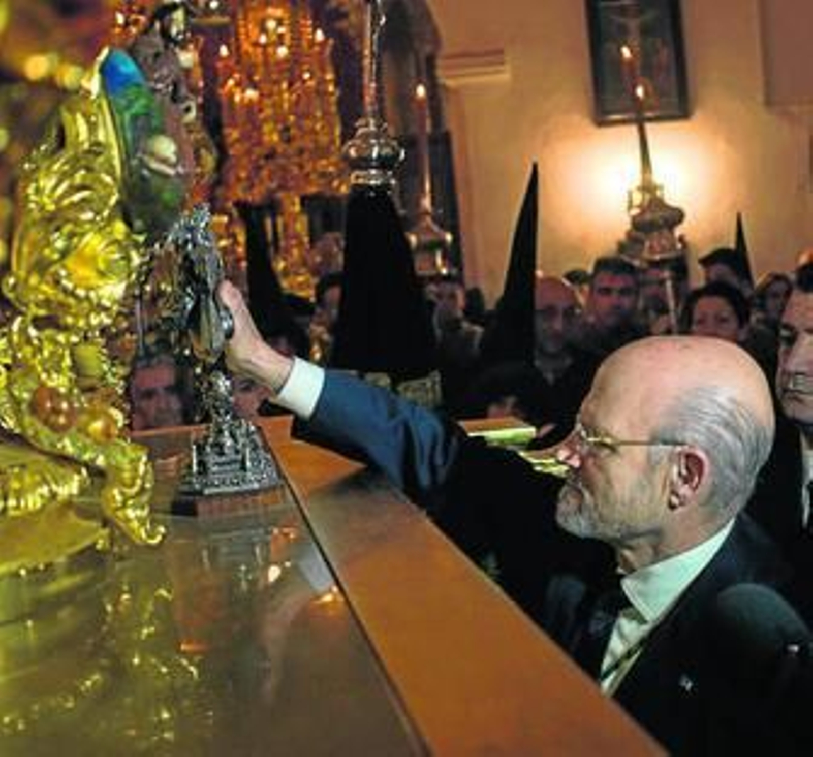 El marqués fue recibido en el templo de San Francisco, sede de esta antigua cofradía, por la Hermana Mayor de la Hermandad, María Antonia Moreno, quien se mostró agradecida por la participación del Marqués en el cortejo, en un año en el que se conmemora el 75 aniversario de la bendición de la imagen del Cristo de la Veracruz, titular de la cofradía y obra del imaginero ayamontino Antonio León Ortega. Tan ilustre visitante fue invitado a realizar el primer golpe de martillo del paso que porta la imagen de Vera Cruz.