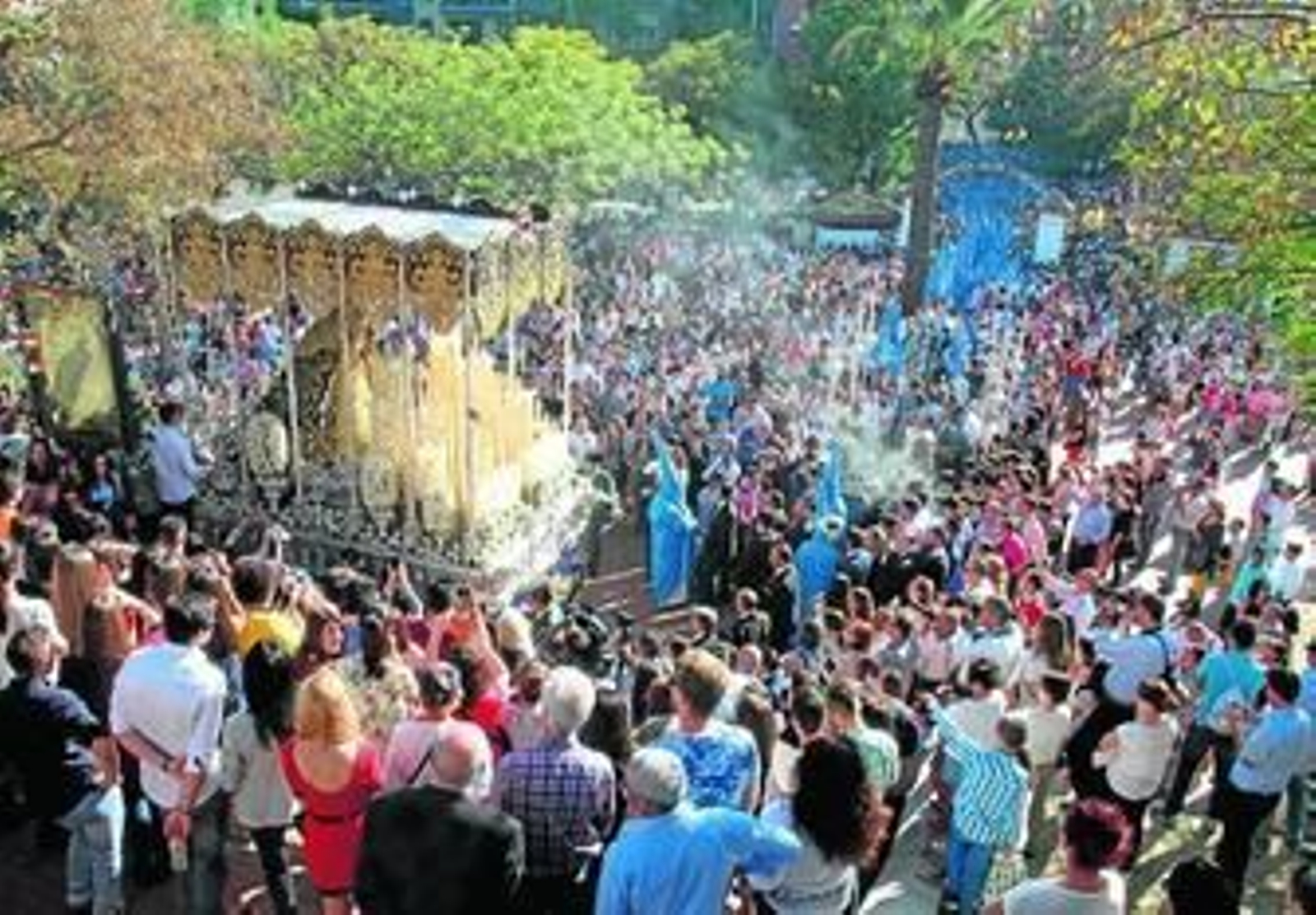 El instante llegó con suma rapidez teniendo en cuenta el número de nazarenos que precede a cada uno de los pasos con los que procesiona la hermandad, 700 en total. Una vez realizadas las dos levantás -la del misterio a cargo del pregonero de la Semana Santa de 2015, Ignacio Molina, y la del palio realizada por el concejal de Cultura, Manuel Remesal-, y cuando el portentoso paso del Señor de la Humildad, vestido con su túnica crema bordada en oro, ya había enfilado Federico Molina, se completaba el esforzado proceso con el que la Victoria sale de su templo: de rodillas, con delicadeza y midiendo cada movimiento, hasta atravesar el dintel y echarla a tierra para, a continuación, realizar una levantá a pulso que arrancó los primeros vivas de la tarde a los devotos de la Virgen.