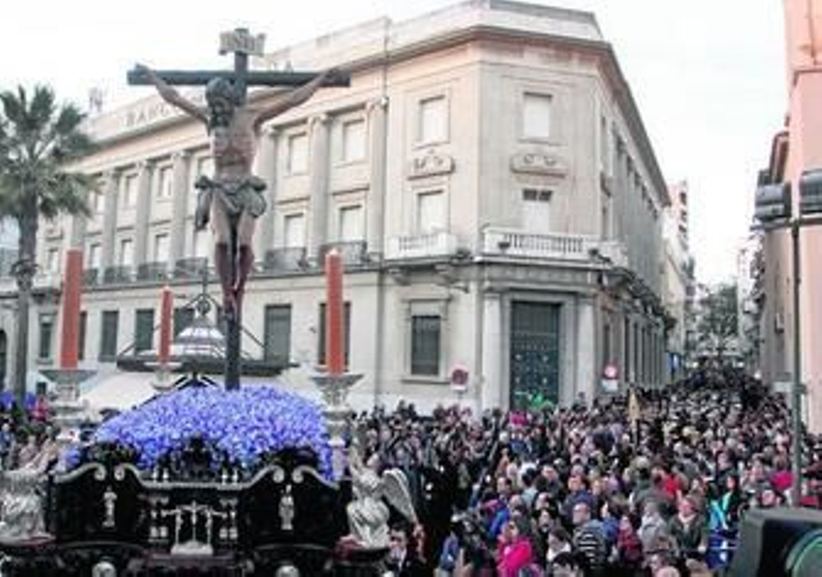 El alcalde de Huelva, Gabriel Cruz, realiza en el interior del templo la primera levantá del paso de misterio del Santísimo Cristo de la Buena Muerte, y una comisión encargada de la reestructuración del paso de la Virgen de Consolación la de éste cuando la marea de nazarenos emergentes del colegio de las Madres Agustinas de la calle Palos baja rauda por la calle Tres de Agosto mientras retumba en sus paredes el eco de la banda de cornetas y tambores del Cristo de la Expiración.