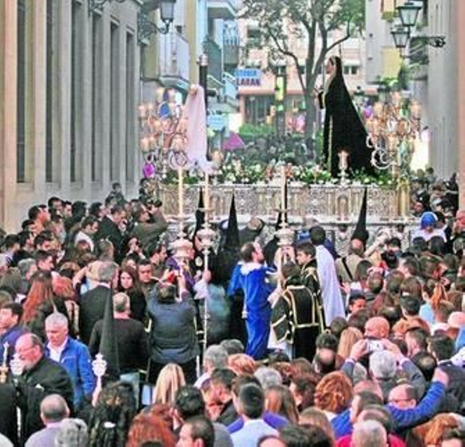 La imagen está ya en la calle cuando, a escasos 10 metros, el murmullo por el vahído de una joven acapara la atención de los presentes. Tras la asistencia de las fuerzas de seguridad, las miradas se vuelven al paso que, sobre los pasos del de misterio, enfila una estación de penitencia única por su condición de centenaria.