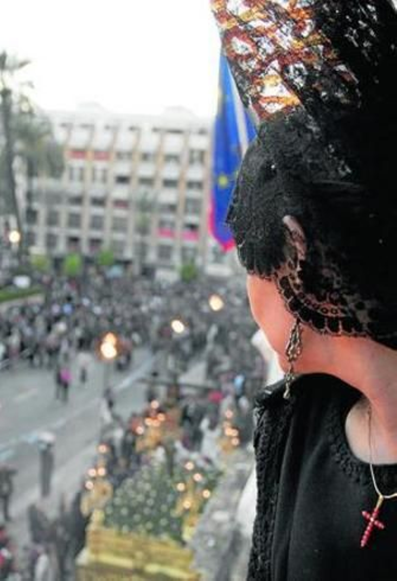 En la salida la cofradía volvía a encontrarse con la luz de la tarde que va dejándose ir reflejada por los cabezos que aún sirven de fondo a este espacio catedralicio. A las puertas del Campus de la Merced, el rector de la Universidad Francisco José Martínes esperaba a la cofradía. Aquí muchas mujeres de mantilla en los balcones, que sin duda hicieron más cofrade este espacio de todos que es la Universidad.
