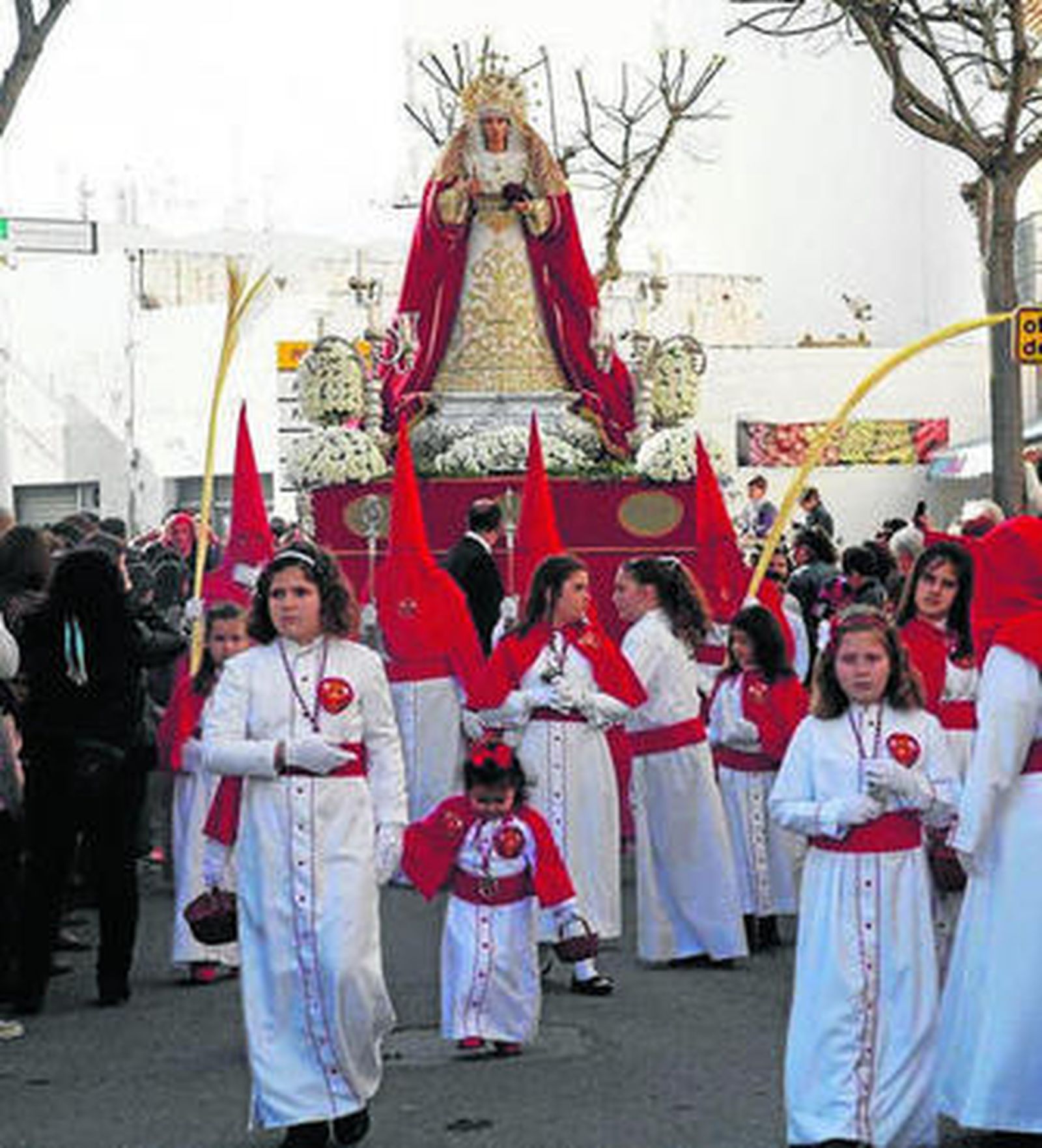 Esta hermandad, con sede canónica en la Parroquia de Nuestra Señora de los Dolores, sacó un año más dos pasos a la calle. El de Nuestro Padre Jesús en su Entrada Triunfal en Jerusalén, exornado con claveles rojos y acompañado por la banda de música Dolores y Consuelo de la capital hispalense, y el de gloria de Nuestra Señora la Reina de los Ángeles, exornado con claveles blancos y acompañado por la banda municipal de música de Isla Cristina. / D. GÓMEZ